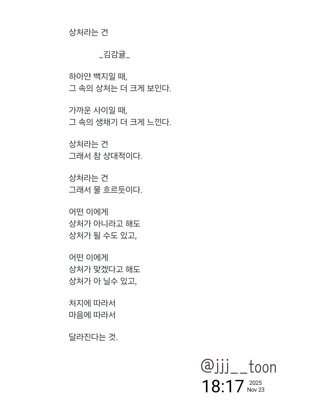 상처라는 건 _김감귤_하아얀 백지일 때,그 속의 상처는 더 크게 보인다.가까운 사이일 때,그 속의 생채기 더 크게 느낀다.상처라는 건그래서 참 상대적이다.상처라는 건그래서 물 흐르듯이다.어떤 이에게상처가 아니라고 해도상처가 될 수도 있고,어떤 이에게상처가 맞겠다고 해도상처가 아 닐수 있고,처지에 따라서마음에 따라서달라진다는 것.