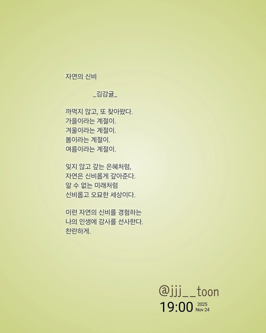 자연의 신비 _김감귤_까먹지 않고, 또 찾아왔다.가을이라는 계절이.겨울이라는 계절이.봄이라는 계절이.여름이라는 계절이.잊지 않고 갚는 은혜처럼,자연은 신비롭게 갚아준다.알 수 없는 미래처럼 신비롭고 오묘한 세상이다.이런 자연의 신비를 경험하는나의 인생에 감사를 선사한다. 찬란하게.