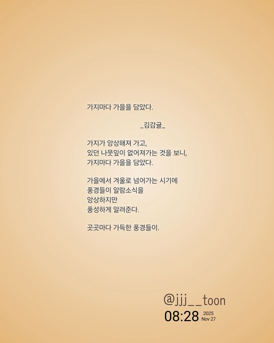 가지마다 가을을 담았다. _김감귤_가지가 앙상해져 가고,있던 나뭇잎이 없어져가는 것을 보니,가지마다 가을을 담았다.가을에서 겨울로 넘어가는 시기에풍경들이 알람소식을 앙상하지만풍성하게 알려준다.곳곳마다 가득한 풍경들이.