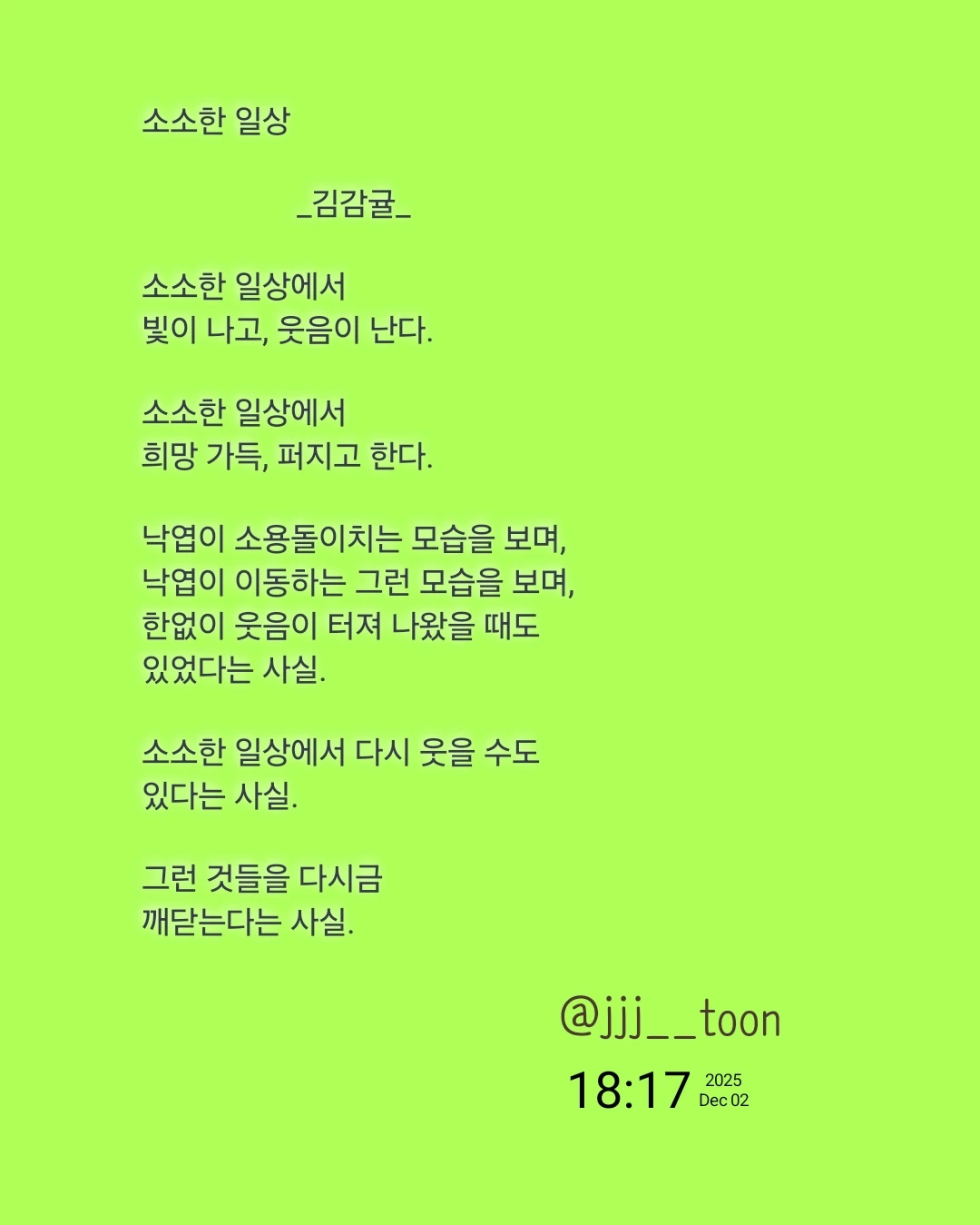 소소한 일상 _김감귤_소소한 일상에서빛이 나고, 웃음이 난다.소소한 일상에서희망 가득, 퍼지고 한다.낙엽이 소용돌이치는 모습을 보며,낙엽이 이동하는 그런 모습을 보며,한없이 웃음이 터져 나왔을 때도있었다는 사실.소소한 일상에서 다시 웃을 수도 있다는 사실.그런 것들을 다시금깨닫는다는 사실.