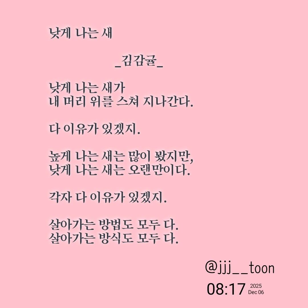 낮게 나는 새 _김감귤_낮게 나는 새가내 머리 위를 스쳐 지나간다.다 이유가 있겠지.높게 나는 새는 많이 봤지만,낮게 나는 새는 오랜만이다.각자 다 이유가 있겠지.살아가는 방법도 모두 다.살아가는 방식도 모두 다.