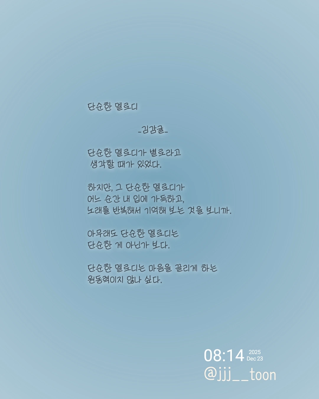 단순한 멜로디 _김감귤_단순한 멜로디가 별로라고 생각할 때가 있었다.하지만, 그 단순한 멜로디가어느 순간 내 입에 가득하고,노래를 반복해서 기억해 보는 것을 보니까.아무래도 단순한 멜로디는 단순한 게 아닌가 보다.단순한 멜로디는 마음을 끌리게 하는 원동력이지 않나 싶다.
