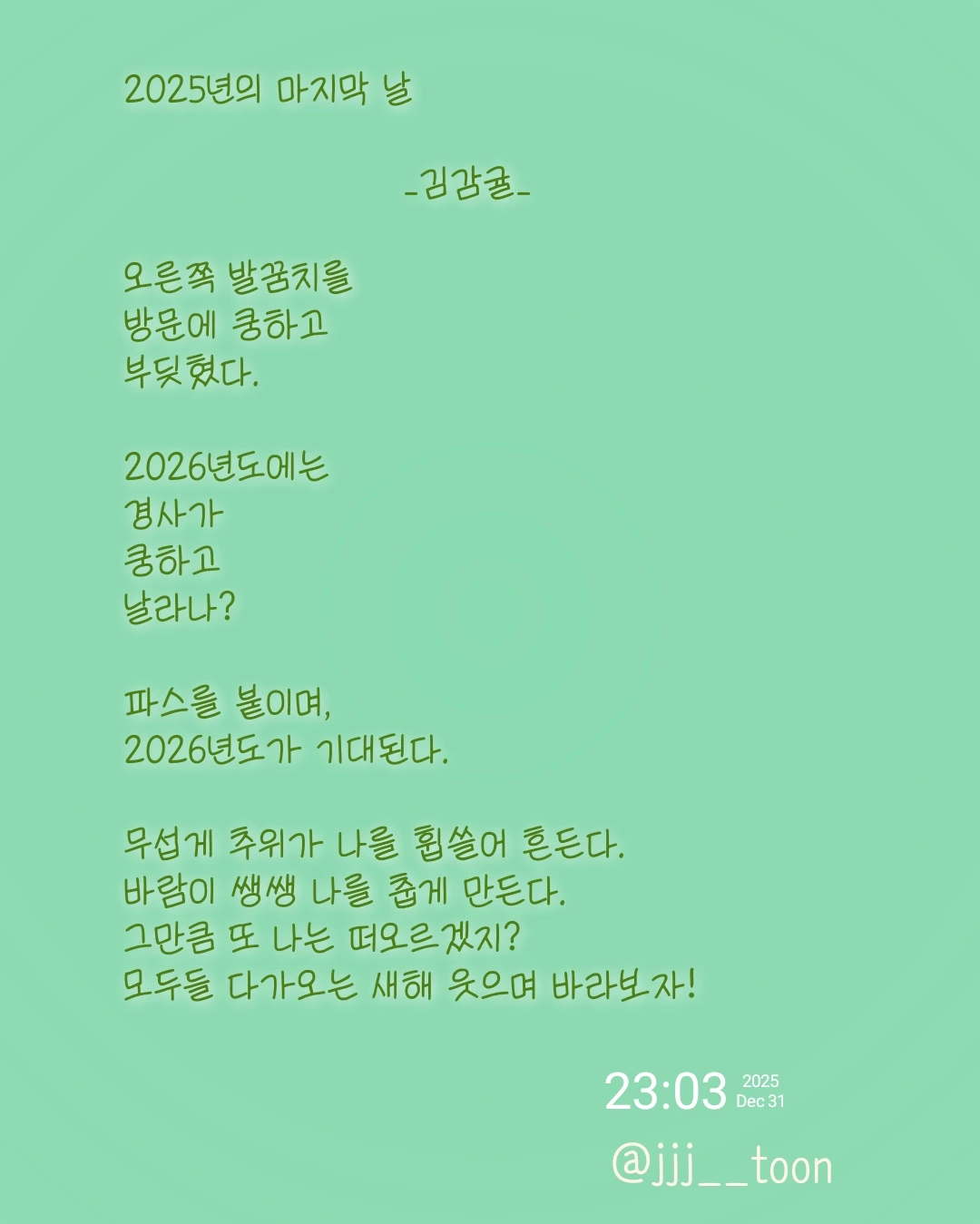 2025년의 마지막 날 _김감귤_오른쪽 발꿈치를방문에 쿵하고부딪혔다.2026년도에는 경사가 쿵하고 날라나?파스를 붙이며,2026년도가 기대된다.무섭게 추위가 나를 휩쓸어 흔든다.바람이 쌩쌩 나를 춥게 만든다.그만큼 또 나는 떠오르겠지?모두들 다가오는 새해 웃으며 바라보자!