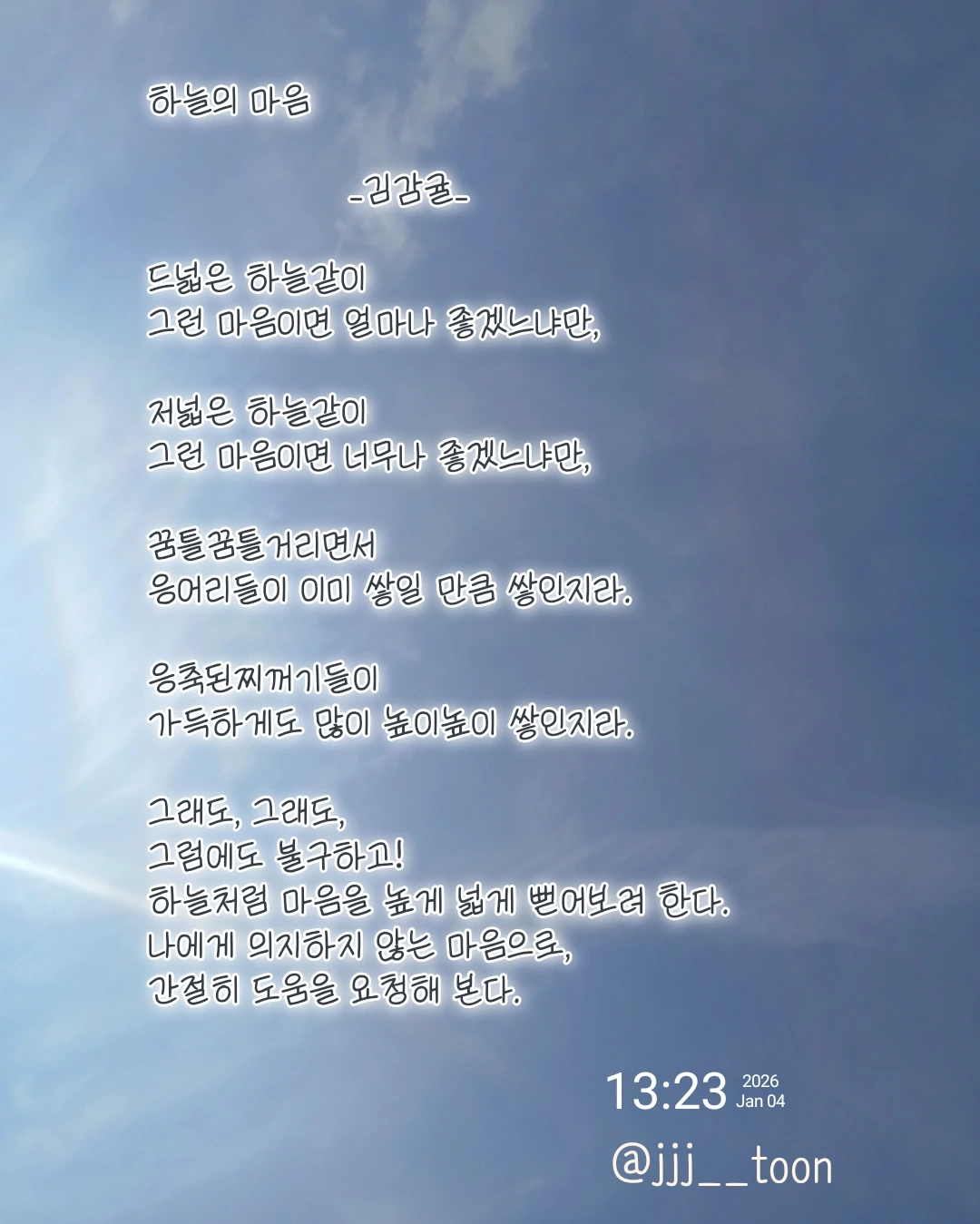 하늘의 마음 _김감귤_드넓은 하늘같이그런 마음이면 얼마나 좋겠느냐만,저넓은 하늘같이그런 마음이면 너무나 좋겠느냐만,꿈틀꿈틀거리면서응어리들이 이미 쌓일 만큼 쌓인지라.응축된찌꺼기들이가득하게도 많이 높이높이 쌓인지라.그래도, 그래도,그럼에도 불구하고!하늘처럼 마음을 높게 넓게 뻗어보려 한다.나에게 의지하지 않는 마음으로,간절히 도움을 요청해 본다.