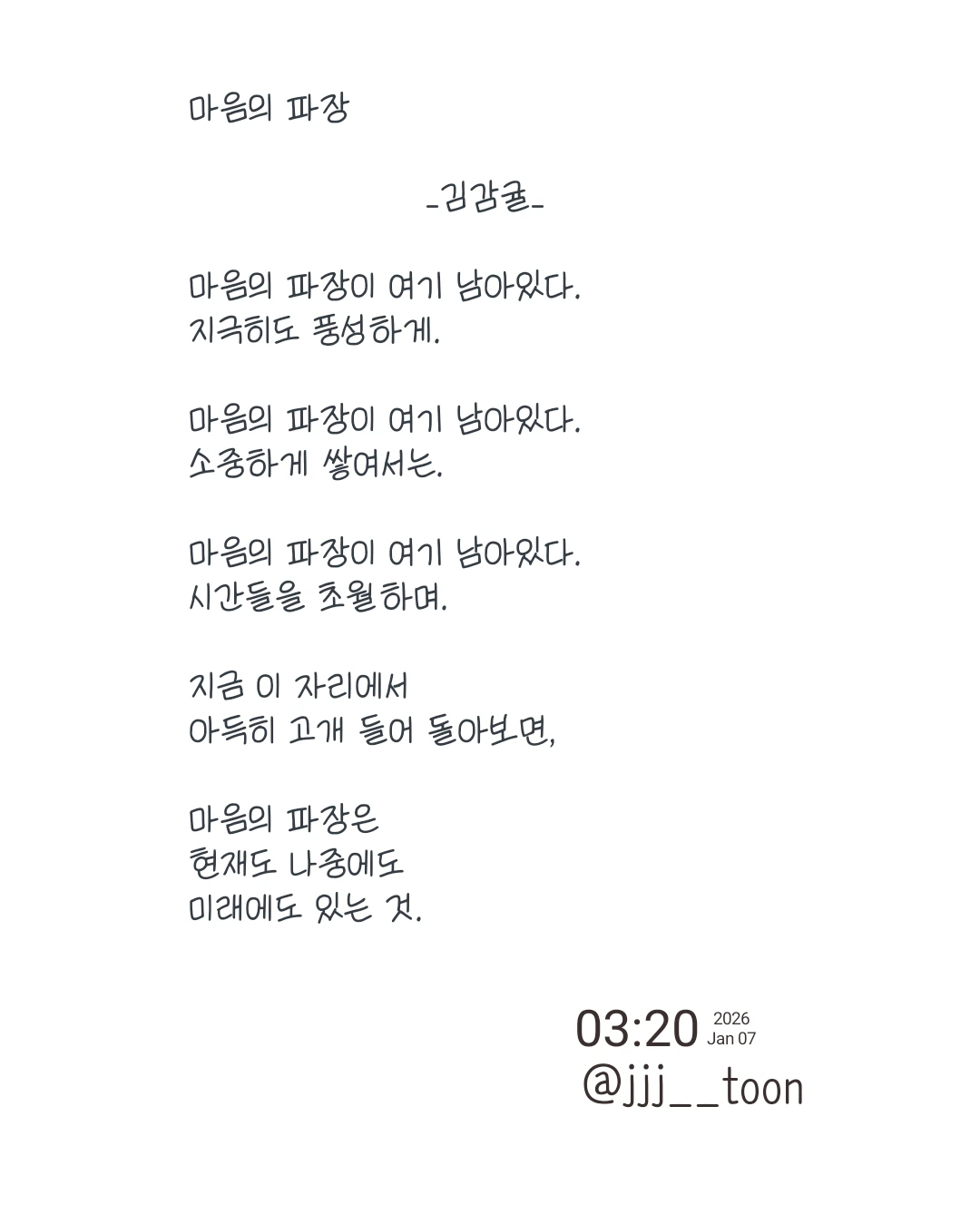 마음의 파장 _김감귤_마음의 파장이 여기 남아있다.지극히도 풍성하게.마음의 파장이 여기 남아있다.소중하게 쌓여서는.마음의 파장이 여기 남아있다.시간들을 초월하며.지금 이 자리에서 아득히 고개 들어 돌아보면,마음의 파장은 현재도 나중에도 미래에도 있는 것.