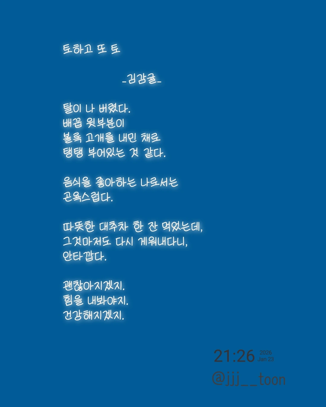 토하고 또 토 _김감귤_탈이 나 버렸다.배꼽 윗부분이 볼록 고개를 내민 채로탱탱 부어있는 것 같다.음식을 좋아하는 나로서는곤욕스럽다. 따뜻한 대추차 한 잔 먹었는데,그것마저도 다시 게워내다니,안타깝다.괜찮아지겠지.힘을 내봐야지.건강해지겠지.