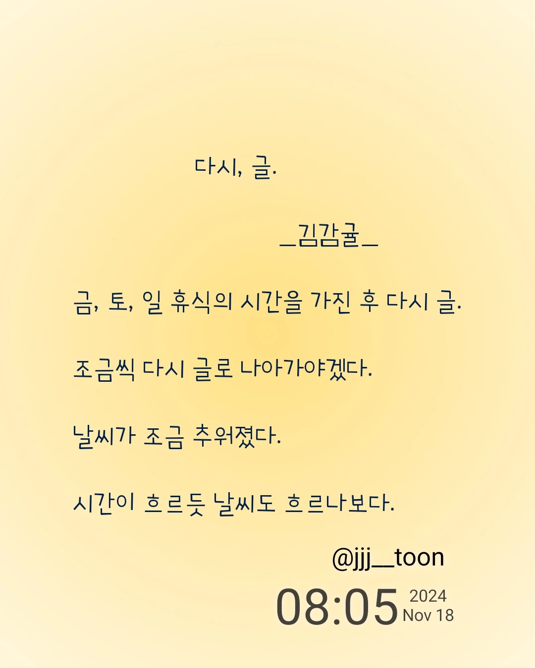 김감귤의 브런치입니다. 시, 짧은 글, 일기를 쓰기도 하며, 자유롭게 글을 쓰고 생각을 표현하는 활동을 좋아합니다. 개인 가치관이나 경험에 비춰 글을 읽을 수 있다고 생각합니다.