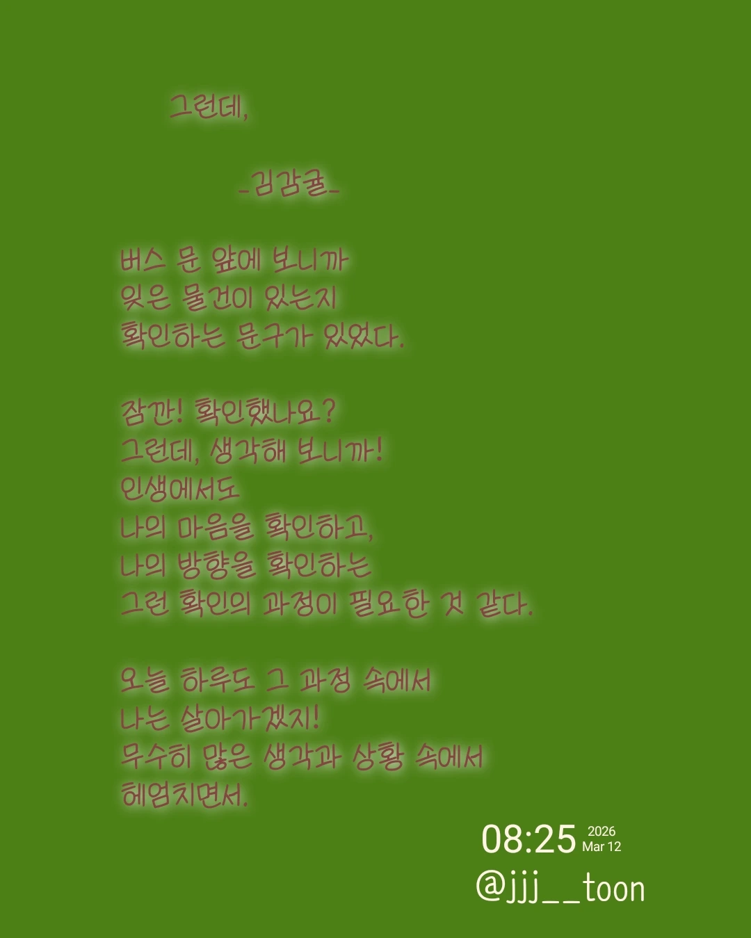 그런데, _김감귤_버스 문 앞에 보니까잊은 물건이 있는지 확인하는 문구가 있었다.잠깐! 확인했나요?그런데, 생각해 보니까!인생에서도 나의 마음을 확인하고,나의 방향을 확인하는 그런 확인의 과정이 필요한 것 같다.오늘 하루도 그 과정 속에서나는 살아가겠지!무수히 많은 생각과 상황 속에서헤엄치면서.
