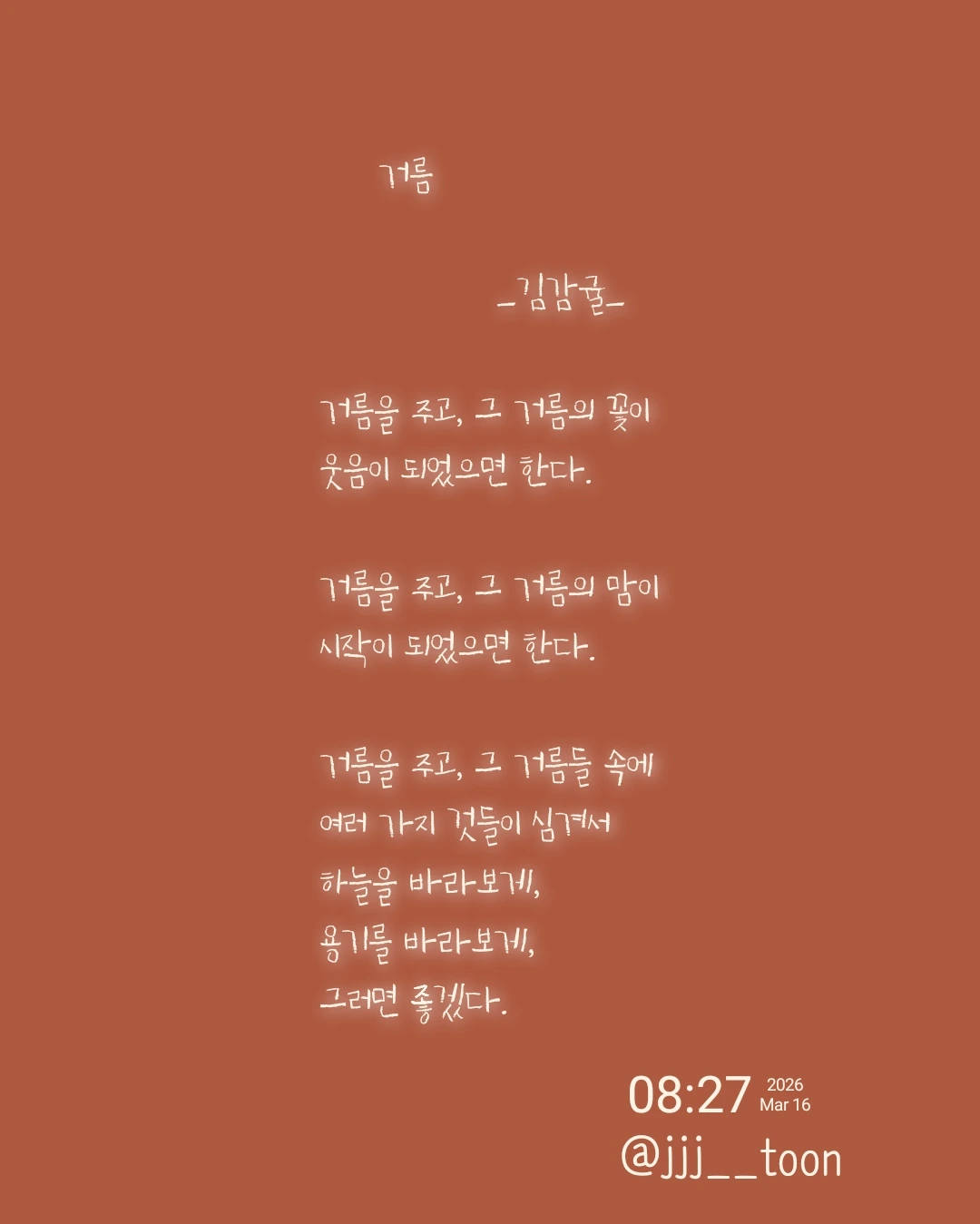 거름 _김감귤_거름을 주고, 그 거름의 꽃이웃음이 되었으면 한다.거름을 주고, 그 거름의 맘이시작이 되었으면 한다.거름을 주고, 그 거름들 속에여러 가지 것들이 심겨서 하늘을 바라보게,용기를 바라보게,그러면 좋겠다.