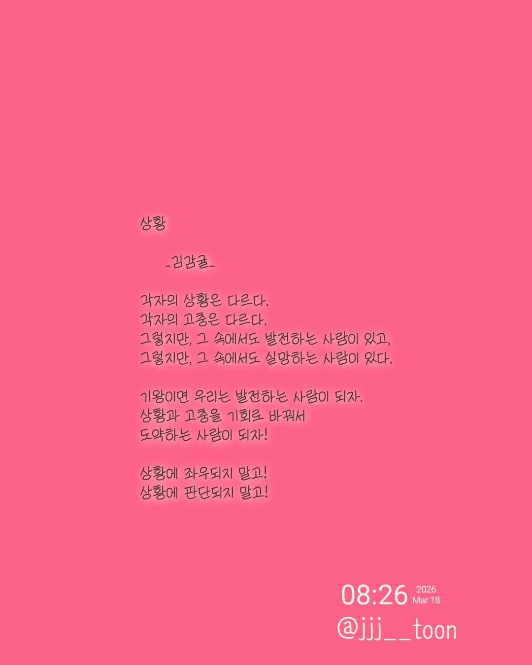 상황 _김감귤_각자의 상황은 다르다.각자의 고충은 다르다.그렇지만, 그 속에서도 발전하는 사람이 있고,그렇지만, 그 속에서도 실망하는 사람이 있다.기왕이면 우리는 발전하는 사람이 되자.상황과 고충을 기회로 바꿔서도약하는 사람이 되자!상황에 좌우되지 말고!상황에 판단되지 말고!