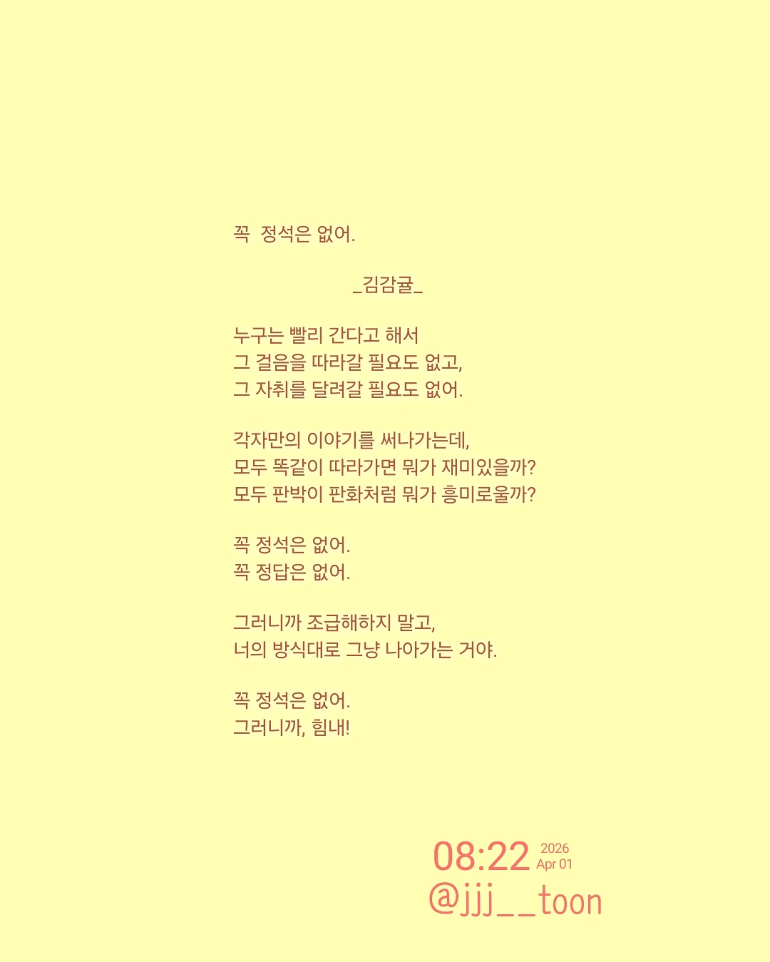 꼭 정석은 없어. _김감귤_누구는 빨리 간다고 해서그 걸음을 따라갈 필요도 없고,그 자취를 달려갈 필요도 없어.각자만의 이야기를 써나가는데,모두 똑같이 따라가면 뭐가 재미있을까?모두 판박이 판화처럼 뭐가 흥미로울까?꼭 정석은 없어.꼭 정답은 없어.그러니까 조급해하지 말고,너의 방식대로 그냥 나아가는 거야.꼭 정석은 없어.그러니까, 힘내!