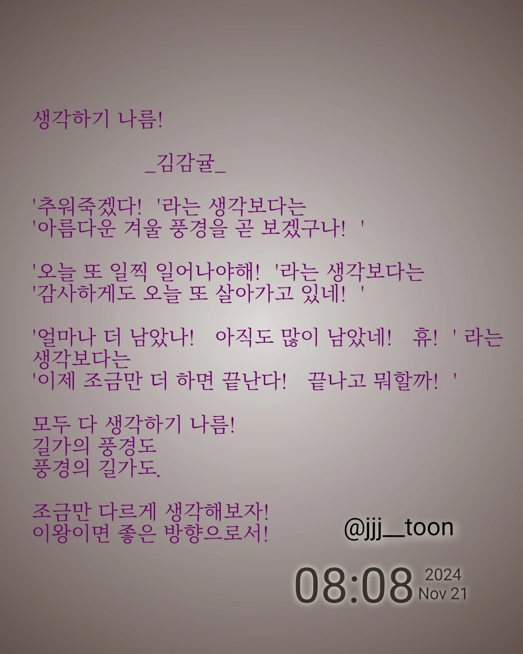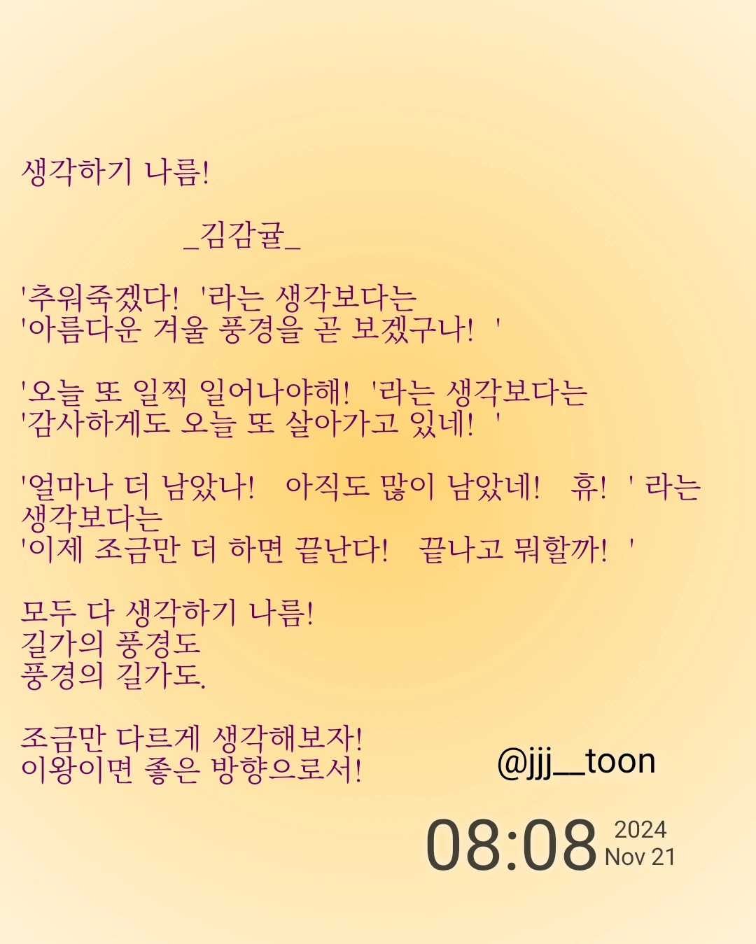 김감귤의 브런치입니다. 시, 짧은 글, 일기를 쓰기도 하며, 자유롭게 글을 쓰고 생각을 표현하는 활동을 좋아합니다. 개인 가치관이나 경험에 비춰 글을 읽을 수 있다고 생각합니다.