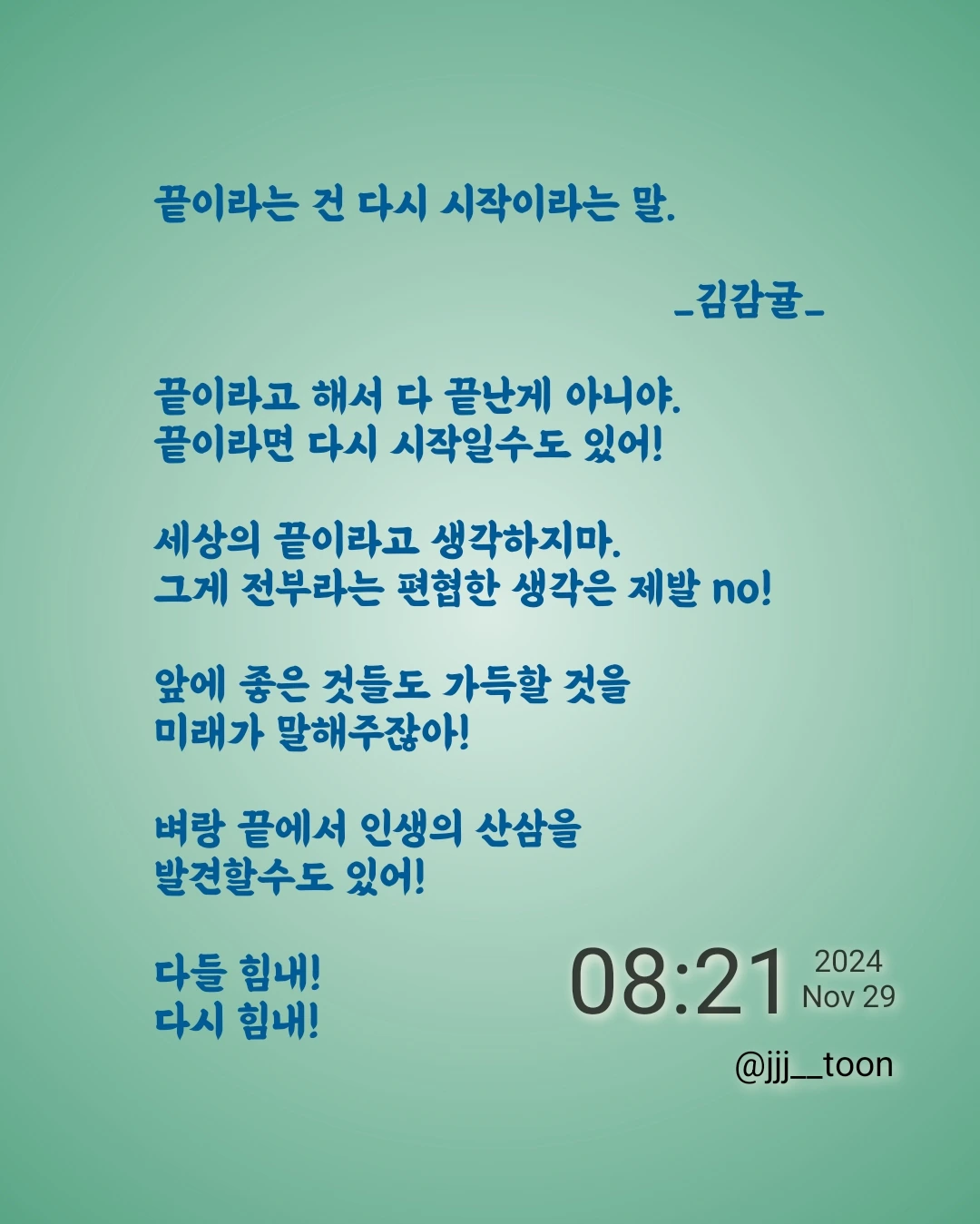 김감귤의 브런치입니다. 시, 짧은 글, 일기를 쓰기도 하며, 자유롭게 글을 쓰고 생각을 표현하는 활동을 좋아합니다. 개인 가치관이나 경험에 비춰 글을 읽을 수 있다고 생각합니다.