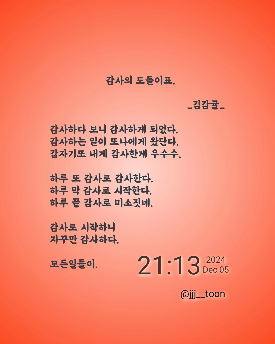 김감귤의 브런치입니다. 시, 짧은 글, 일기를 쓰기도 하며, 자유롭게 글을 쓰고 생각을 표현하는 활동을 좋아합니다. 개인 가치관이나 경험에 비춰 글을 읽을 수 있다고 생각합니다.