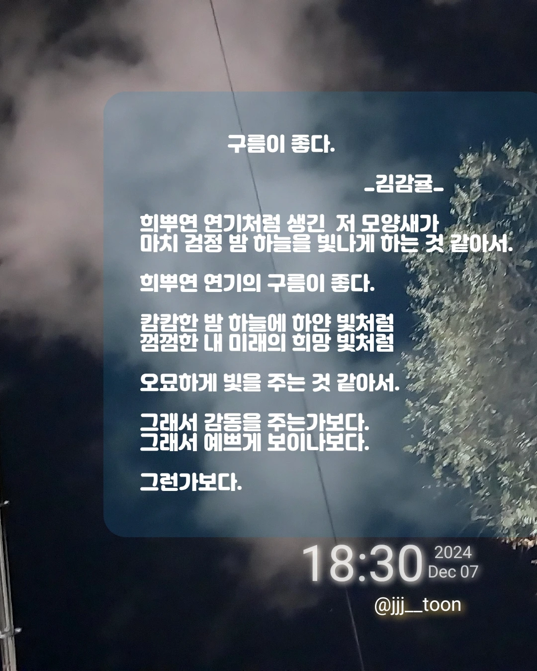 하늘의 구름은 낮에 보는 것과 저녁에 보는 것이 다르게 느껴지는 것 같다. 저녁에 보는 구름을 보면서 '구름이 좋다'라는 시를 적어봤다.
