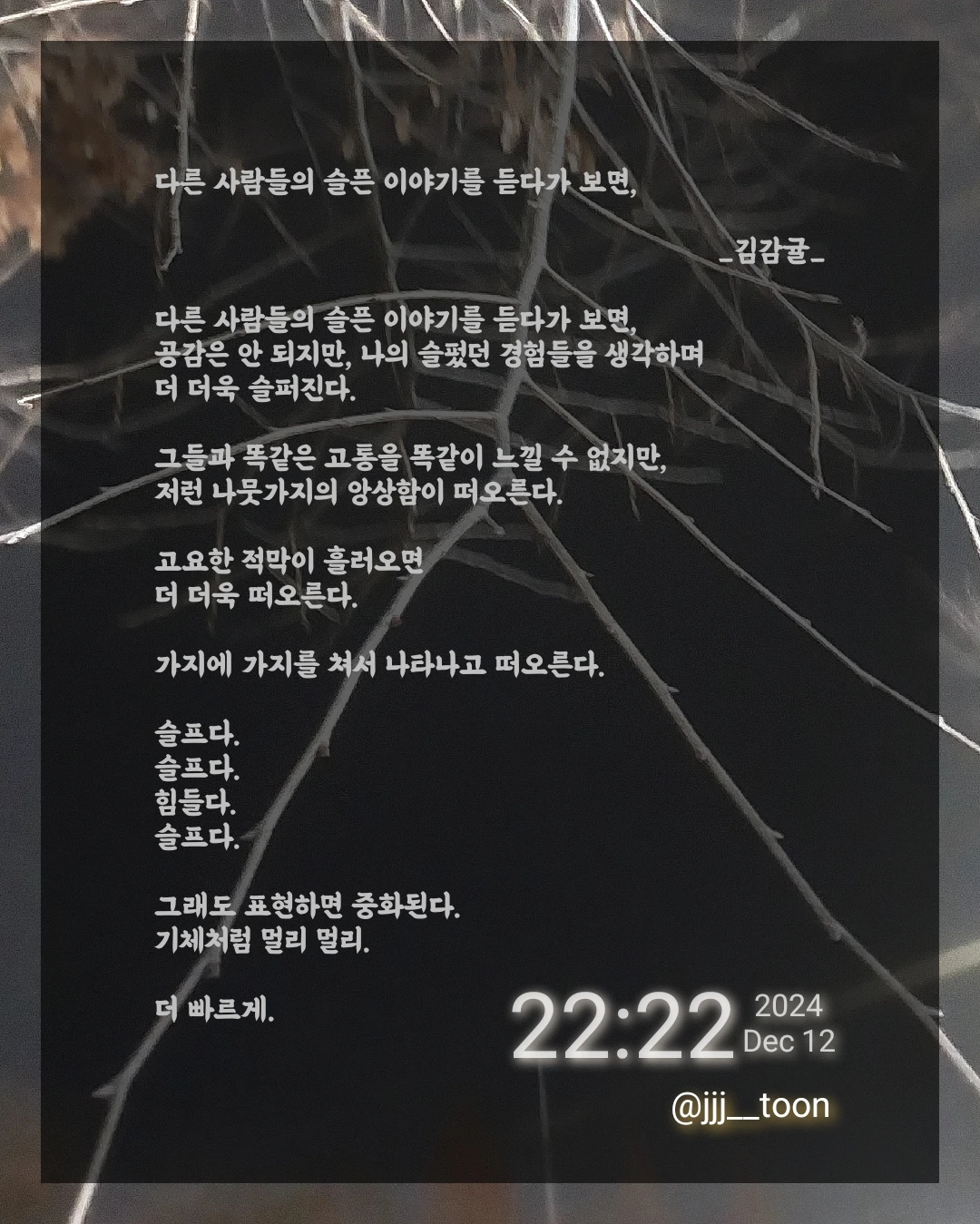 김감귤의 브런치입니다. 시, 짧은 글, 일기를 쓰기도 하며, 자유롭게 글을 쓰고 생각을 표현하는 활동을 좋아합니다. 개인 가치관이나 경험에 비춰 글을 읽을 수 있다고 생각합니다.