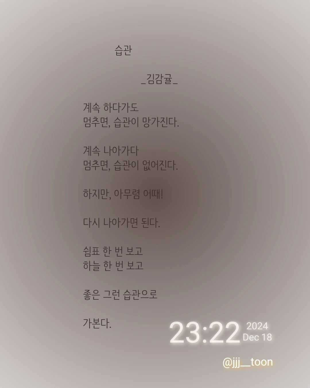 김감귤의 브런치입니다. 시, 짧은 글, 일기를 쓰기도 하며, 자유롭게 글을 쓰고 생각을 표현하는 활동을 좋아합니다. 개인 가치관이나 경험에 비춰 글을 읽을 수 있다고 생각합니다.