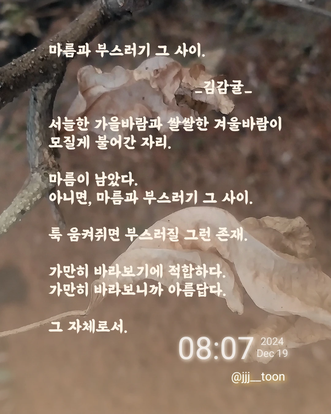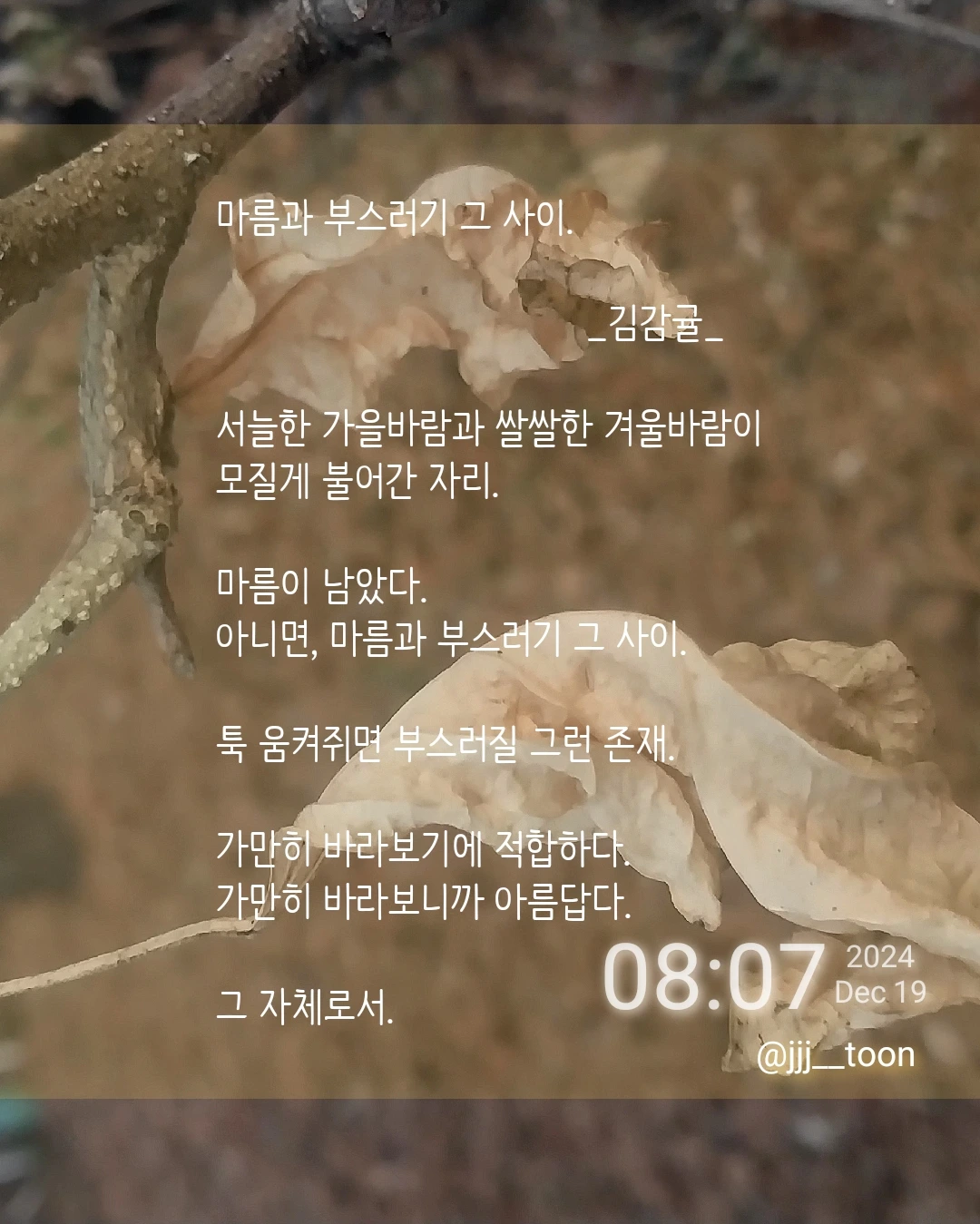 김감귤의 브런치입니다. 시, 짧은 글, 일기를 쓰기도 하며, 자유롭게 글을 쓰고 생각을 표현하는 활동을 좋아합니다. 개인 가치관이나 경험에 비춰 글을 읽을 수 있다고 생각합니다.