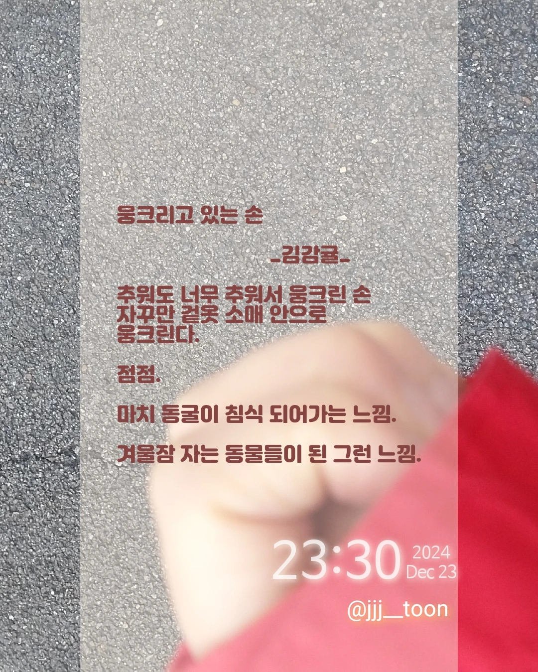 아침 추위에 점점 손이 소매 안으로 웅크려지는 모습을 보면서 재미있기도 해서 그것을 표현하고 싶었다.