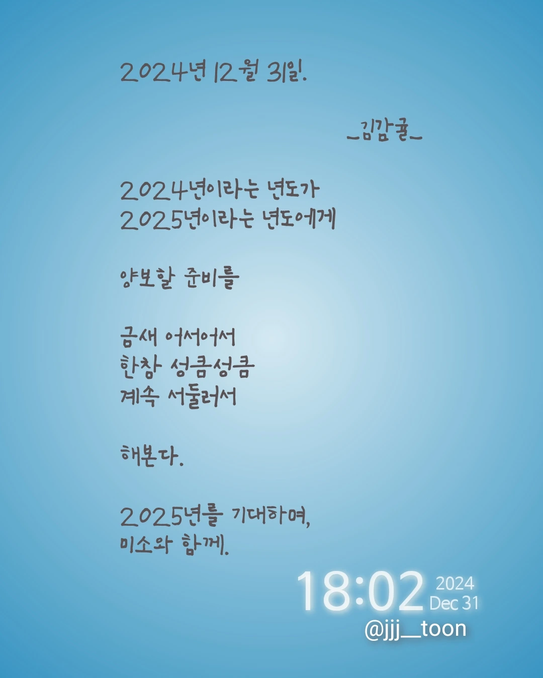 김감귤의 브런치입니다. 시, 짧은 글, 일기를 쓰기도 하며, 자유롭게 글을 쓰고 생각을 표현하는 활동을 좋아합니다. 개인 가치관이나 경험에 비춰 글을 읽을 수 있다고 생각합니다.