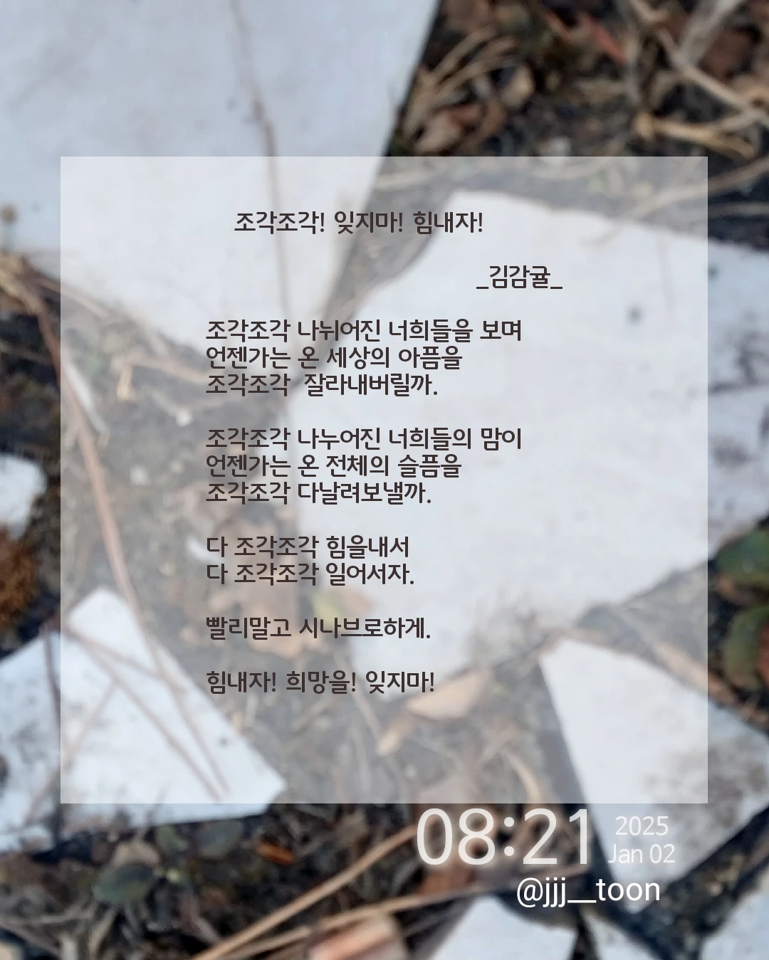 김감귤의 브런치입니다. 시, 짧은 글, 일기를 쓰기도 하며, 자유롭게 글을 쓰고 생각을 표현하는 활동을 좋아합니다. 개인 가치관이나 경험에 비춰 글을 읽을 수 있다고 생각합니다.