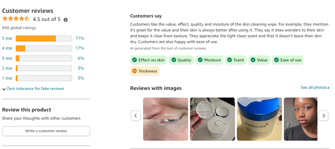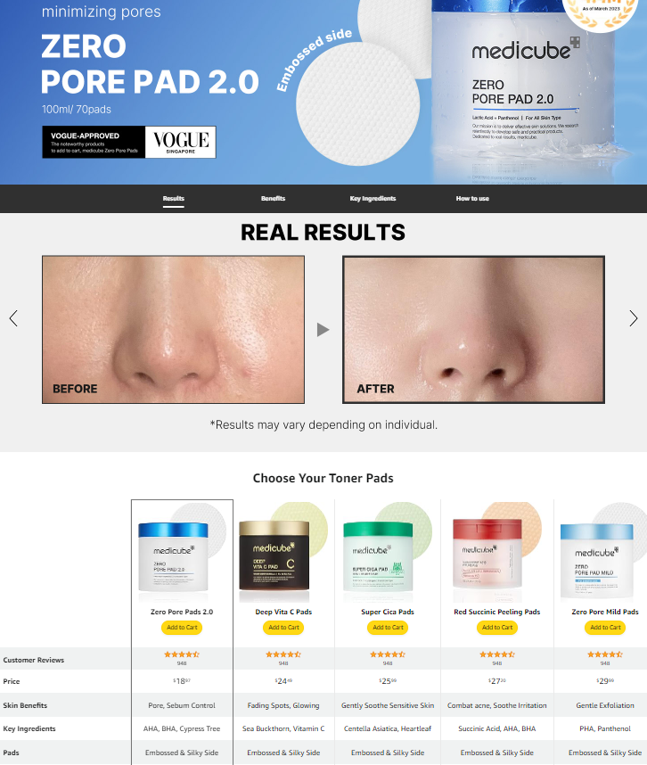 미국 아마존은 구체적인 피부 변화와 효과 입증을 강조하며, 직접 경험을 통한 신뢰를 얻습니다. 이는 미국 소비자들이 제품의 구체적인 효과와 개인적인 사용 경험을 중시하는 경향을 반영