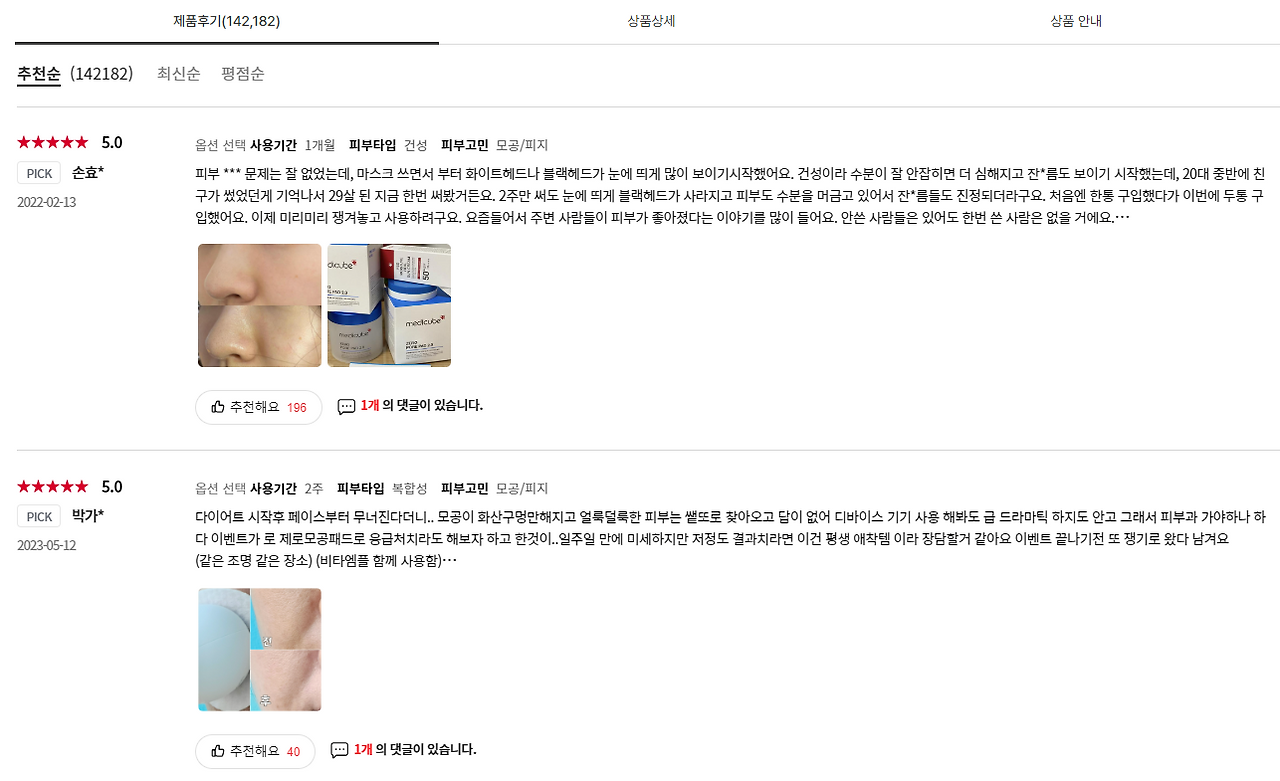 -> 제품에 대한 신뢰도와 효과를 중요시 해서 임상입증된 효능과 개선된 사진을 상세사진으로 삽입 필요