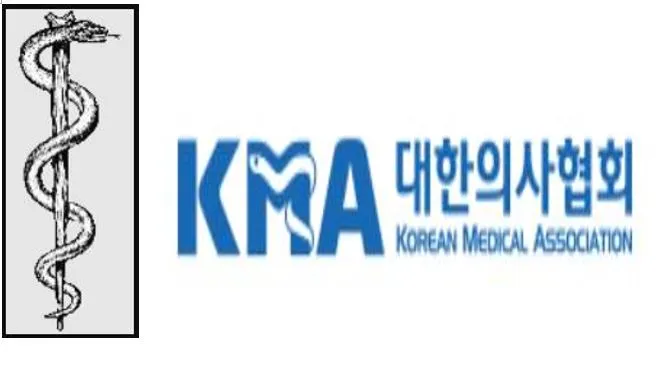 왼쪽이 아스클레피오스의 지팡이, 오른쪽이 대한 의사협회의 로고. M자를 둘러싼 뱀이 보이시죠?
