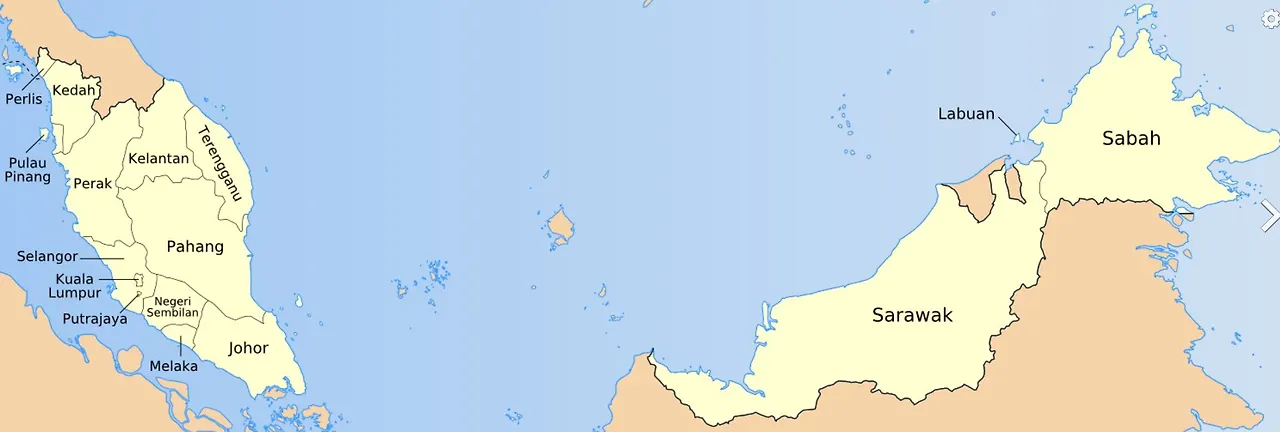 말레이시아 지도 - 사라왁(Sarawak)과 북보르네오(Sabah). 위키피디아 펌