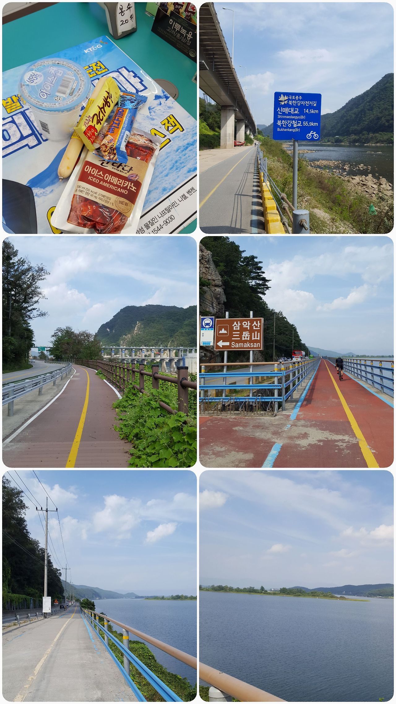 백양리역을 지나 강촌역에 도착했다. 출발 후 55km 지점이다. 이곳은 편의점과 음식점이 많은데 닭갈비집이 가장 많다. 간식을 보충해 잠시 휴식을 취했다. 휴식 후 바닥에 표시된 안내를 따라 좁은 다리를 지나 아래로 내려오면 오른편으로 북한강을 끼고 자전거길이 이어진다. 멀리 의암댐도 보인다. 가다 보면 삼악산 간이주차장 옆을 지나가게 되는데 작년에 그곳에 주차하고 춘천까지 왕복 라이딩을 한 경험이 있다. 춘천까지는 그림 같은 길이 이어지므로 강촌역부터 춘천까지의 왕복 라이딩도 권하고 싶다. 삼악산을 지나면 노면 상태도 한층 좋아지고 스치는 풍광도 근사하다.