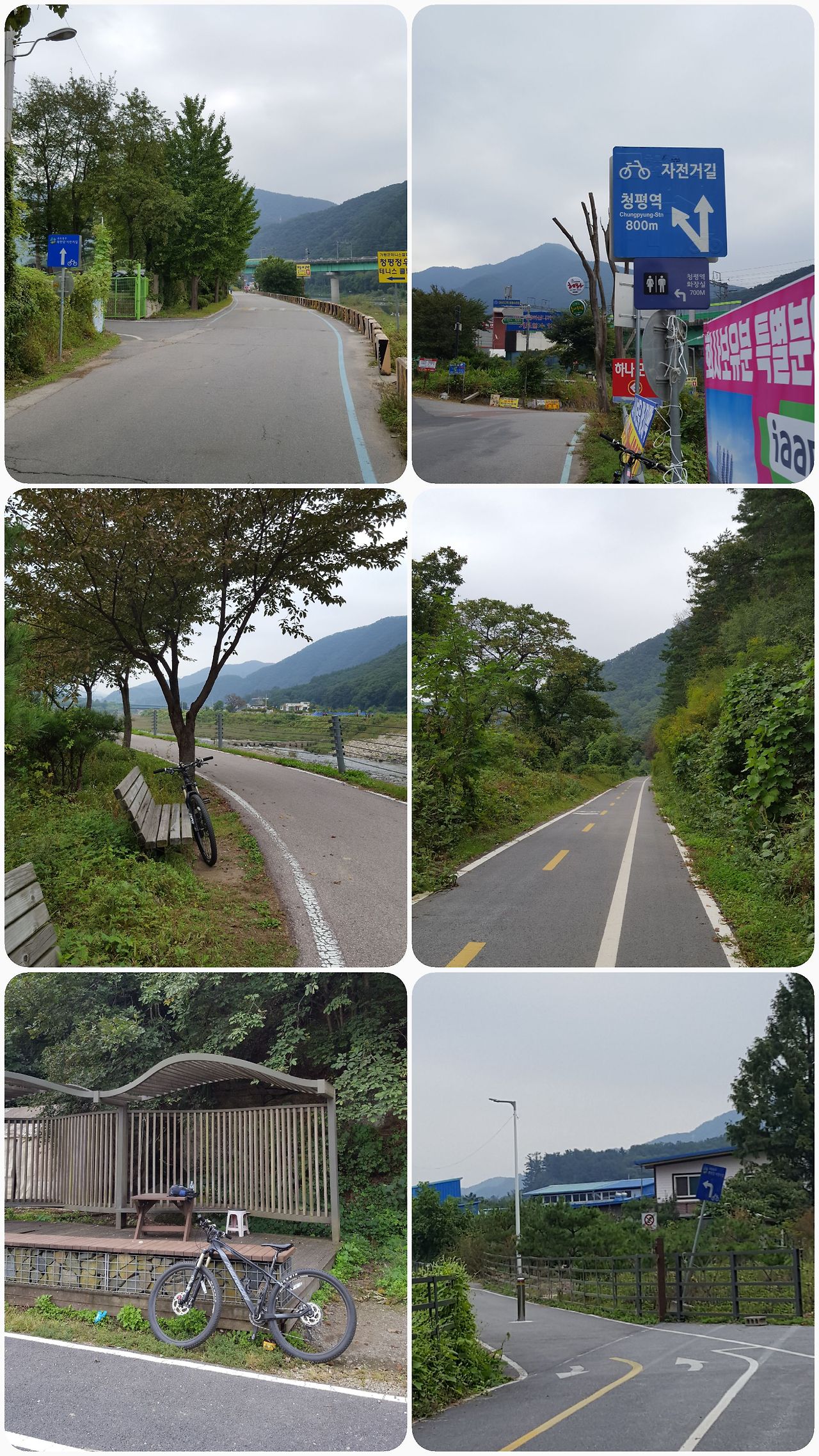 대성리역을 지났다. 긴장의 시작이다. 평소 대성리역까지는 자주 왔지만 그 너머부터는 생경하기 때문이다. 그때마다 힘이 된 것은 아래 사진 상단의 '국토종주 북한강 자전거길' 푸른색 표지판이다. 서울 근교의 자전거길은 표지판이 적소에 위치해 있다. 친절히 안내해 주므로 걱정할 필요가 없다. 대성리를 지나 소나무 숲 속에 쉼터가 있다. 쉼터를 지나면 청평대교 아래에 갈림길이 나온다. 우리는 '가평 청평' 방향으로 가면 된다. 조금 더 가면 도심으로 들어가는 다리를 건너 청평역으로 향하게 된다. 다리 끝에서 자전거길 표지판을 따라 우회전하면 청평역이 나온다