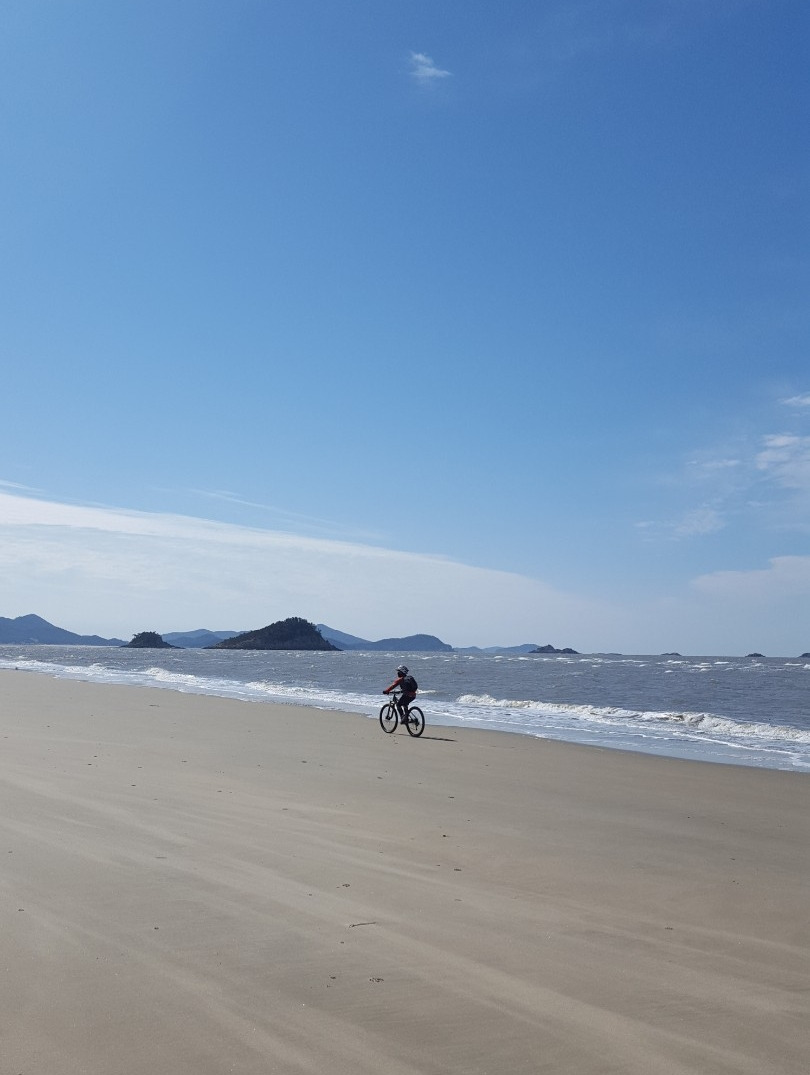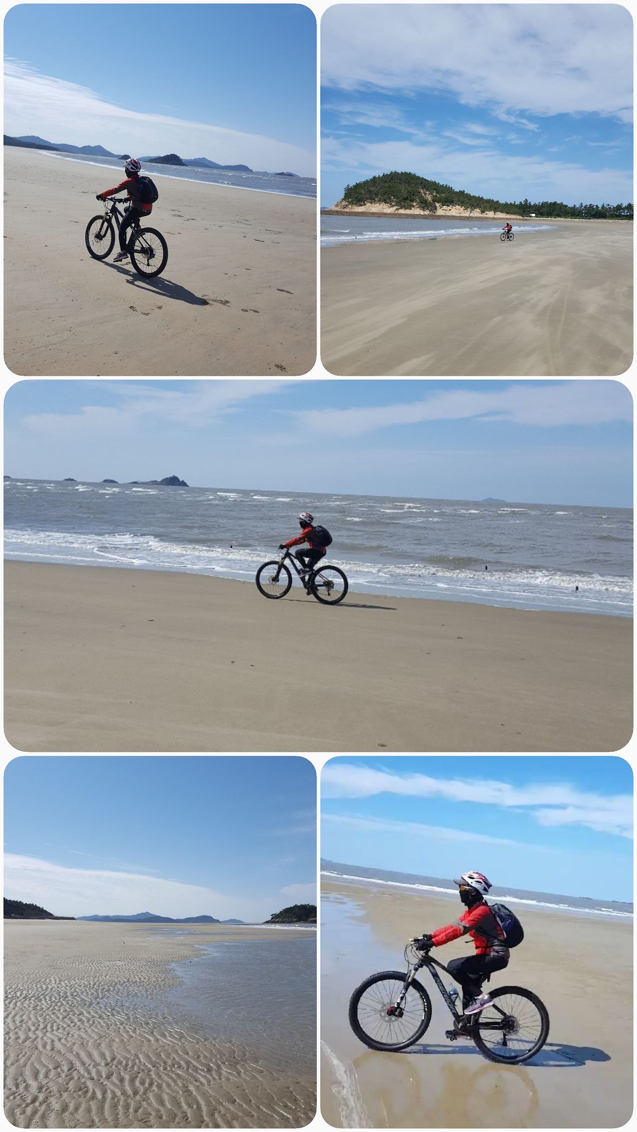 이 해변은 길이 7.5km 폭 300m의 국내 최장의 해변이다. 특히 모래사장이 탄탄해서 해변승마장으로도 이용하고 있다. 해변 라이딩을 시작했다. 지금까지 지나온 어떤 길보다도 노면 상태가 좋다. 아무런 제약 없이 그저 달리면 된다. 자유로움 그 자체이다. 눈앞에 바다를 두고 일렁이는 파도를 벗 삼아 달린다는 걸 상상이나 할 수 있을까. 보통 해변이라면 발이 푹푹 빠져 걷기조차 힘들건대 하물며 라이딩이라니. 때마침 강한 뒷바람도 불어와 우리의 해변 라이딩을 더욱 신나게 해주었다. 때때로 부드러운 모래바람이 낮고 소리 없이 일어 신비로운 기운마저 감돌게 했다. 백사장위로는 염낭게의 흔적인 작은 모래 덩이들이 기하학적인 문양으로 새겨져 있다. 드문드문 물이 빠져 생긴 주름진 곳들이 있는데 울퉁불퉁하니 피해 가면 된다. 우리가 도착한 시간이 오후 1시경이다. 그 시간쯤이면 썰물 때라 해변도 단단해지고 바람도 뒷바람이라 라이딩엔 최적의 시간이다.