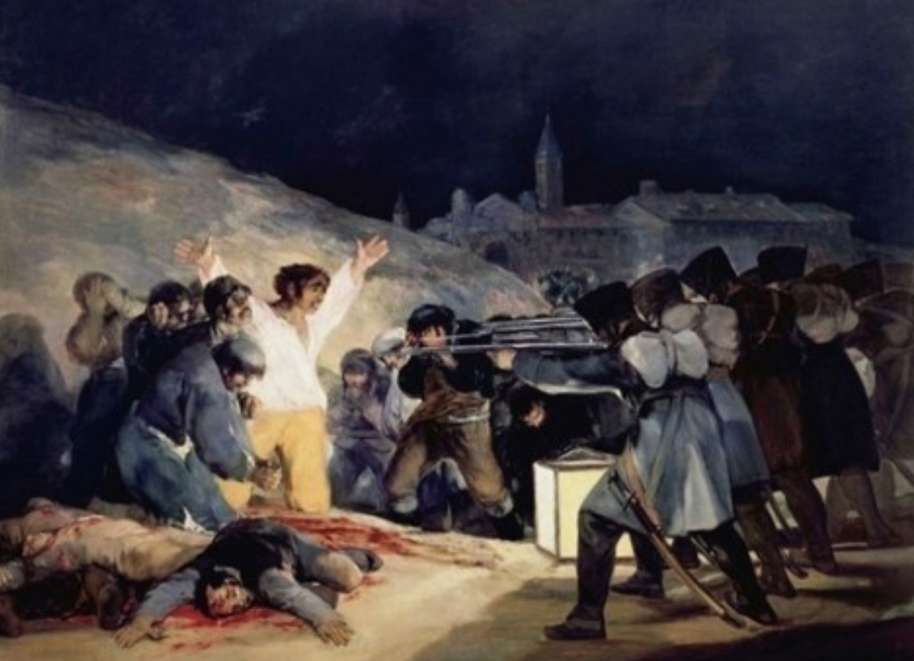 위의 그림은 <1808년 5월 3일 마드리드>라는 작품입니다. 민중을 학살하는 군인들의 만행을 표현했습니다. 이 그림은 나폴레옹의 스페인 침공 때의 모습을 그린 것입니다. 당시 프랑스를 비롯한 유럽은 대혁명으로 인해 봉건사회가 무너지고 시민의식이 싹터 근대사회로 도약하던 시기였어요. 그러나 스페인은 아직 강력한 왕정국가였고 부패한 권력과 종교로 인해 시민의식이 발현되지 못하던 상태였지요. 고야는 나폴레옹을 지지했어요. 스페인 역시 근대사회로의 변환이 필요하다고 생각한 계몽주의자였다고 할 수 있지요. 그래서 나폴레옹의 개혁이 스페인에서도 영향을 끼치길 원했습니다. 그러나 나폴레옹이 유럽 전역을 침공하자 고야는 실망했습니다. <1808년 5월 3일 마드리드>는 스페인을 침공해 많은 학살을 자행한 나폴레옹 군대를 고발한 작품입니다.