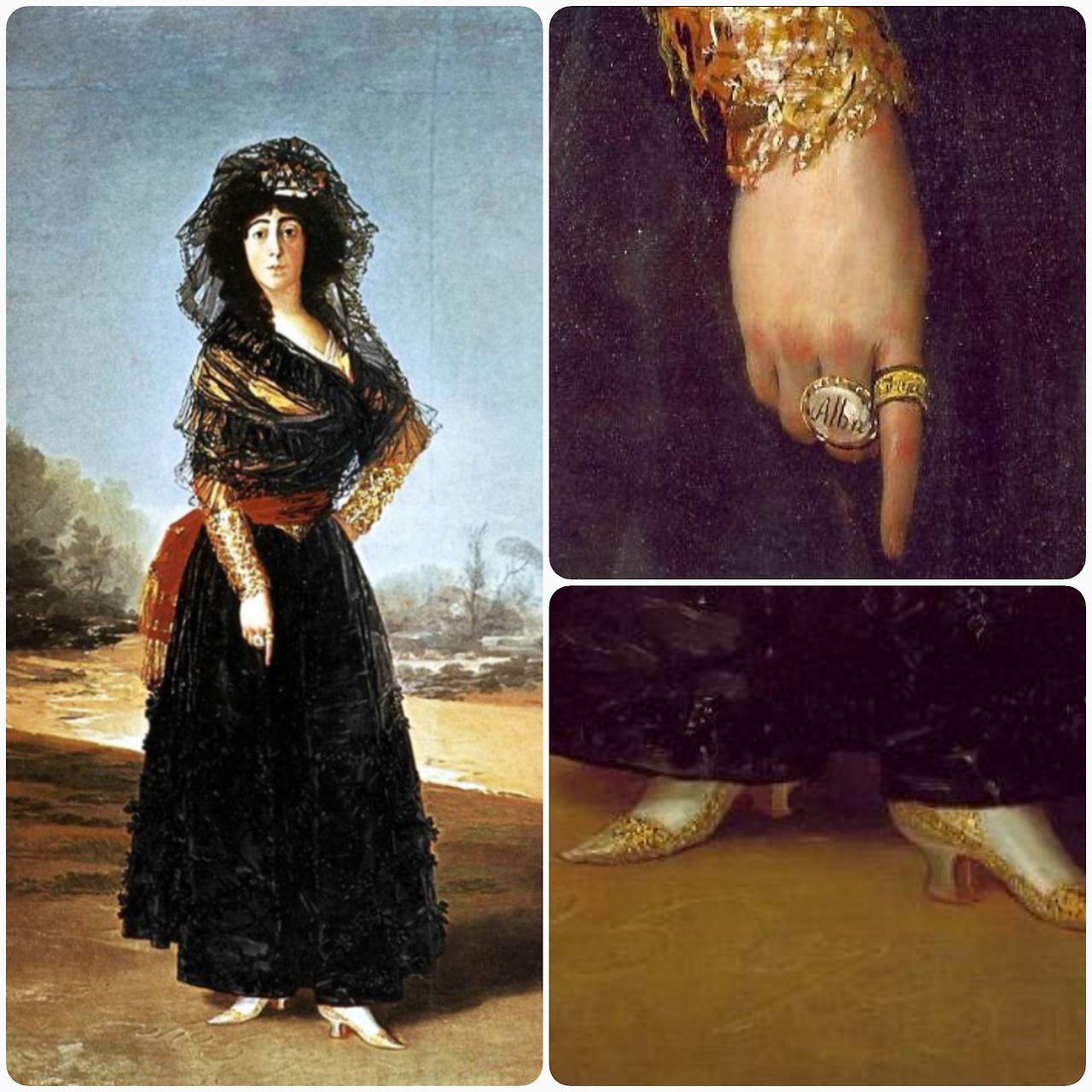 아래 그림에서 모델은 손가락으로 바닥을 가리키고 있지요. 거기엔 'solo Goya(오직 고야뿐)'이라고 쓰여있습니다. 그만큼 둘은 열정적인 사랑을 했던 거 같아요. 알바 부인에게는 얼마 안 가서 다른 애인이 생겼지만 죽을 때까지 이 글 표지 배경으로 쓴 고야의 자화상을 지니고 있었다는 이야기가 전해집니다. 아마 평생 마음속 깊이 고이 간직하고픈 사랑이었나 봅니다.