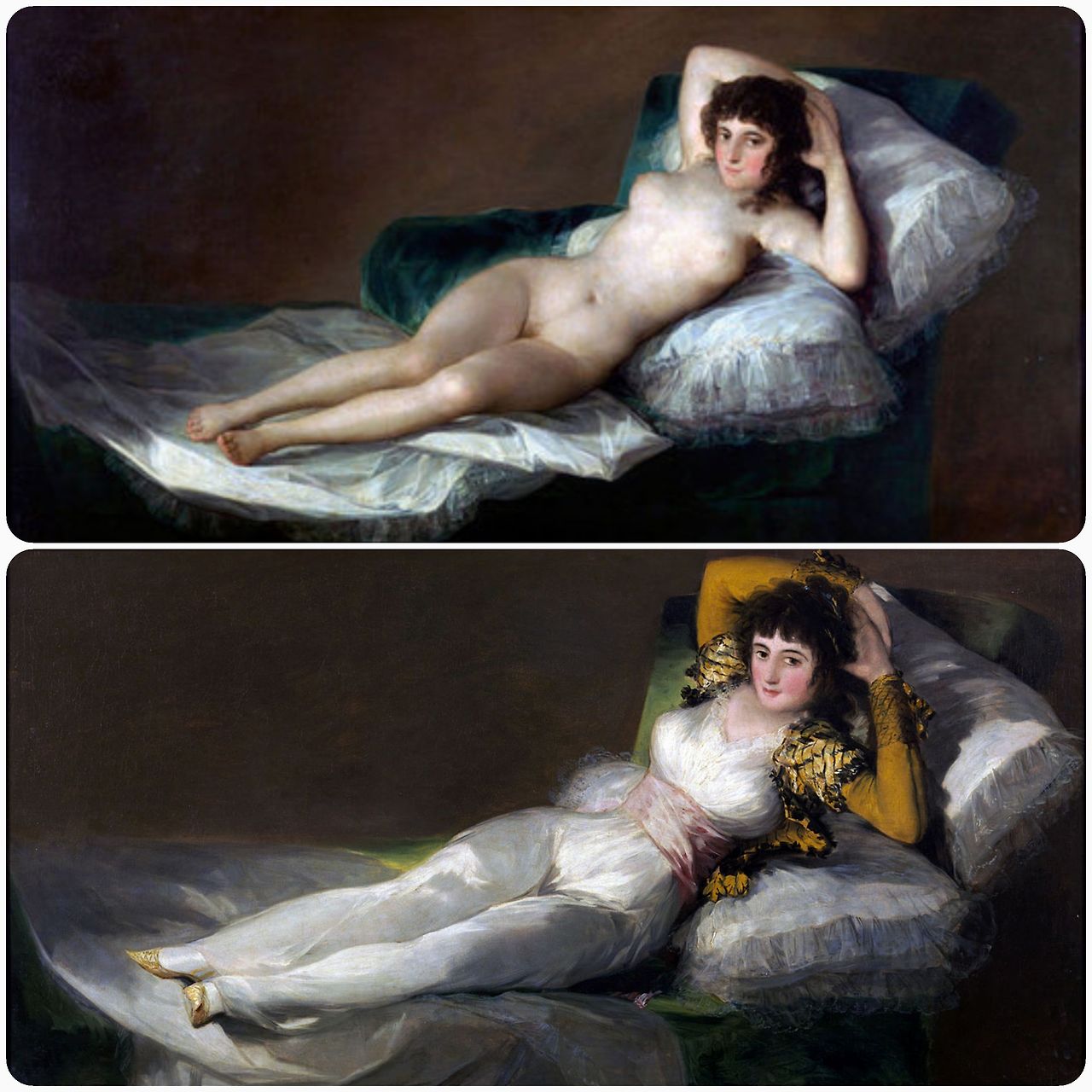 같은 모델, 같은 포즈의 두 번의 그림. 게다가 한 번은 옷을 입고 한 번은 옷을 벗고. 흔치 않은 일이지요. 18세기 유럽에서 그것도 독실한 가톨릭 국가인 스페인에서 여성의 누드를 그린 다는 건 있을 수 없는 일이니까요. 그보다 전세대인 벨라스케스의 <거울을 보는 비너스> 이래 스페인 역사상 두 번째 누드화였습니다.