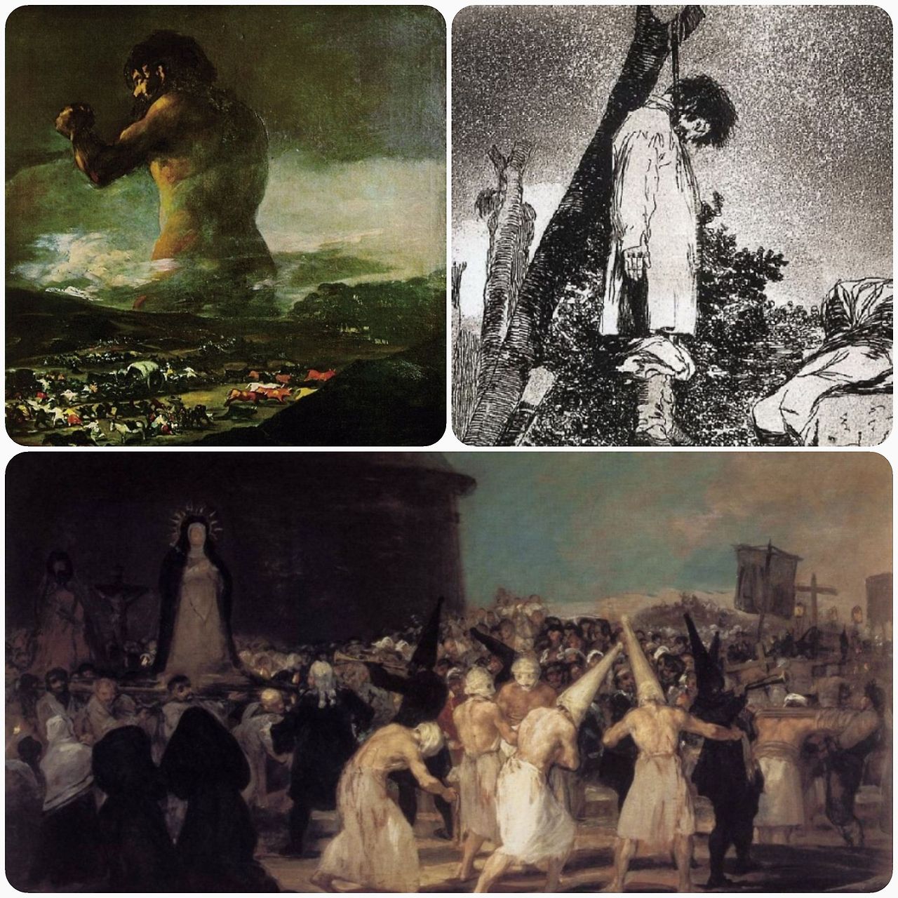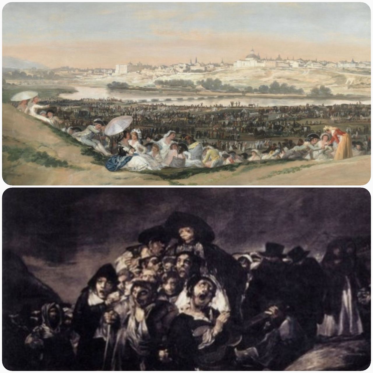 '검은 그림들'의 느낌을 가장 잘 설명해 드리기 위해 아래 그림 두 편을 소개합니다. 두 그림은 시기만 다를 뿐 같은 장소, 같은 사건을 그린 것이지요. 성 이시돌의 축제와 그 축제를 가기 위한 순례행렬을 표현한 것입니다. 둘의 극명한 차이가 충격이지요. 두 그림은 약 30여 년의 시간적 차이가 있습니다. 그 사이 고야는 다른 인격의 사람이 된 것 같네요.