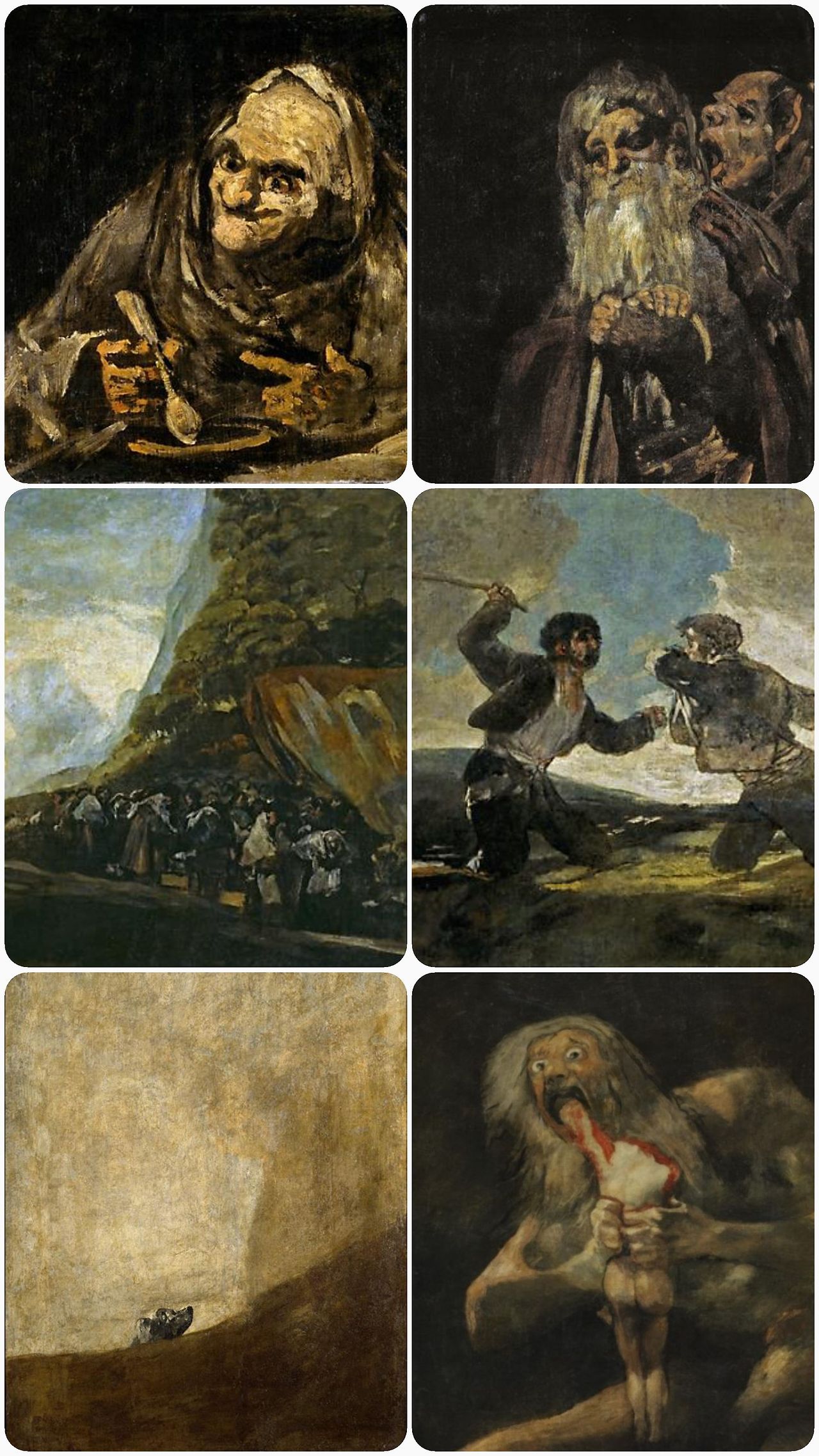 고야는 오래전 초상화를 그릴 때부터 검은색을 효과적으로 사용했죠. 주로 배경은 검게 표현하여 모델의 모습을 더 부각하는 기법을 썼습니다. 그래서 사람들은 그의 검은색은 '스페인의 검은색'이라고 불렀습니다. 그 검은색이 14점 그림 전반에 깔려 음침함과 괴기스러움, 광기를 어둡고 강렬하게 표현하고 있는 겁니다.