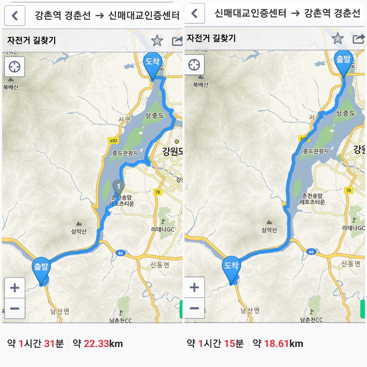 경로 : 강촌역 ~ 송암스포츠타운 ~ 공지천 ~ 신매대교 ~ 강촌역 원점회기 (40km)