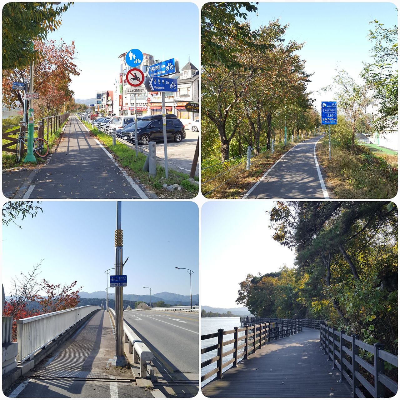 춘천역에서 시작해도 괜찮지만 가을을 더욱 만끽하려면 강촌역 출발을 권하고 싶다. 강촌역을 출발해 좌회전을 한다. 곧이어 만나는 다리를 지나 자전거길로 들어선다. 가파른 내리막을 지나면 오른편에 의암호를 두고 평탄한 자전거길이 이어진다. 이 길이 끝나면 데크길이 나오고 곧이어 춘천 방향의 이정표가 보이는데 이정표대로 우회전하여 다리를 건넌다.
