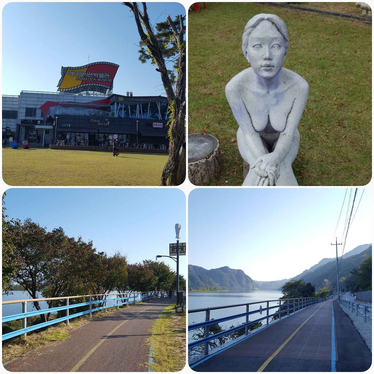구비구비 데크길을 지나 애니메이션 박물관을 만난다. 이곳은 방문객 등이 많으니 조심해서 지나자. 가을을 물씬 느끼면서 달리던 중 길 옆 카페에 아름다운 조각상이 눈에 띈다. 어쩐지 낯익은 건 왜일까. 계속 달려서 삼악산으로 향하는 데크길에 진입한다.