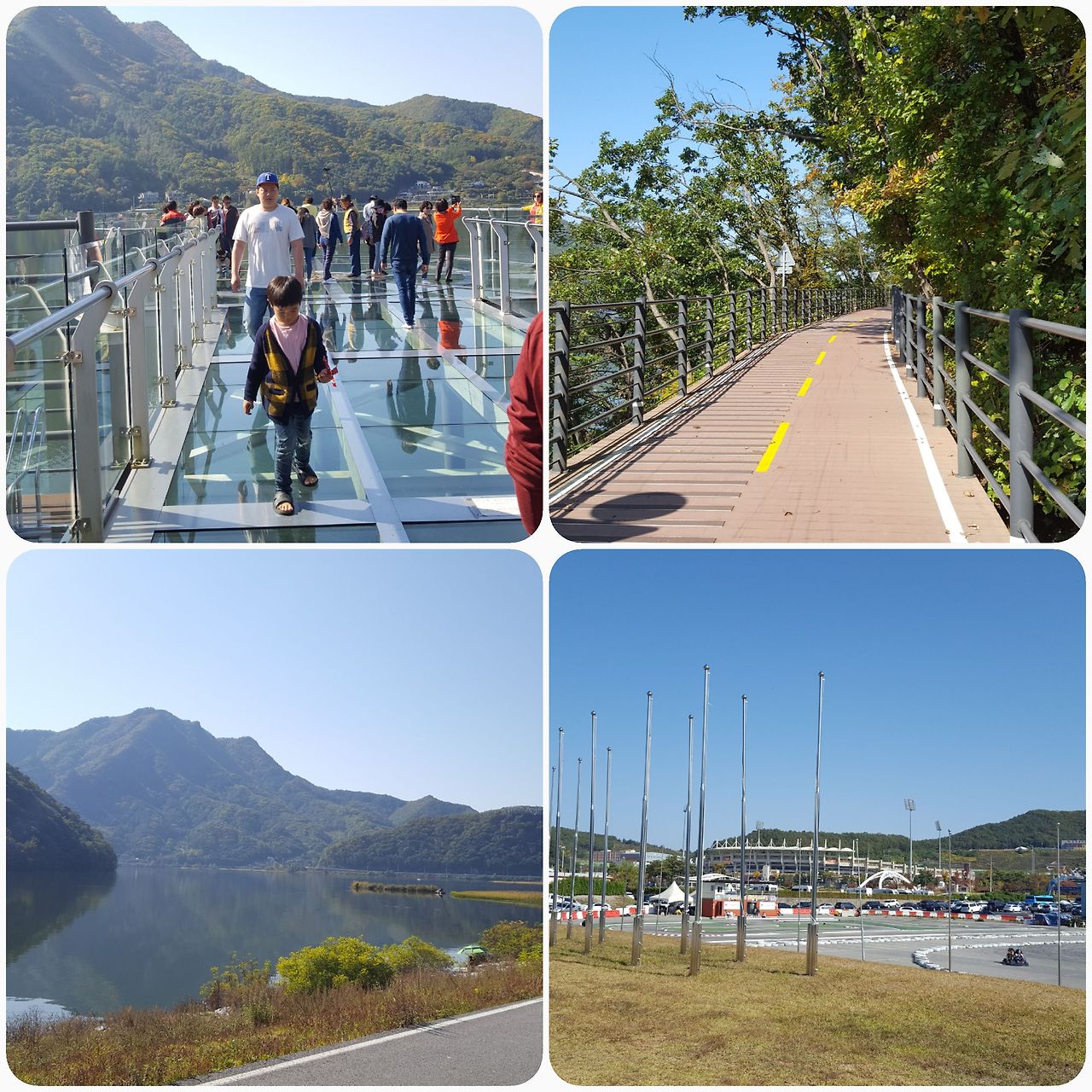 스카이 워크. 그리 크지 않은 규모지만 유리 바닥 아래로 보이는 호수가 아찔하다. 신발을 벗고 들어갈 수 있다. 이 곳은 라이더뿐만 아니라 관람객으로 붐비므로 서행해야 한다. 여기를 통과해 구비구비 나무데크를 달리면서 가을의 의암호를 만난다. 데크가 끝나면 송암 스포츠 센터가 나오고 자전거길은 계속 이어진다. 이 구간 역시 스포츠센터 이용객과 자동차가 많으므로 조심해서 지나야 한다.