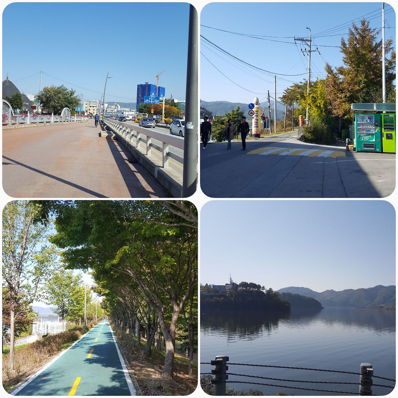 노란 가을을 느끼고 나오면 에디오피아 참전 기념관이 보이고 그 앞에서 이정표를 따라 왼편 자전거 길로 진입한다. 입구에는 슈퍼와 자전거 대여점이 있고 주차장이 있어 무척 혼잡하다. 조심히 지나 자전거 길로 들어서면 공지천 길이고 다시 고즈넉함이 이어진다.
