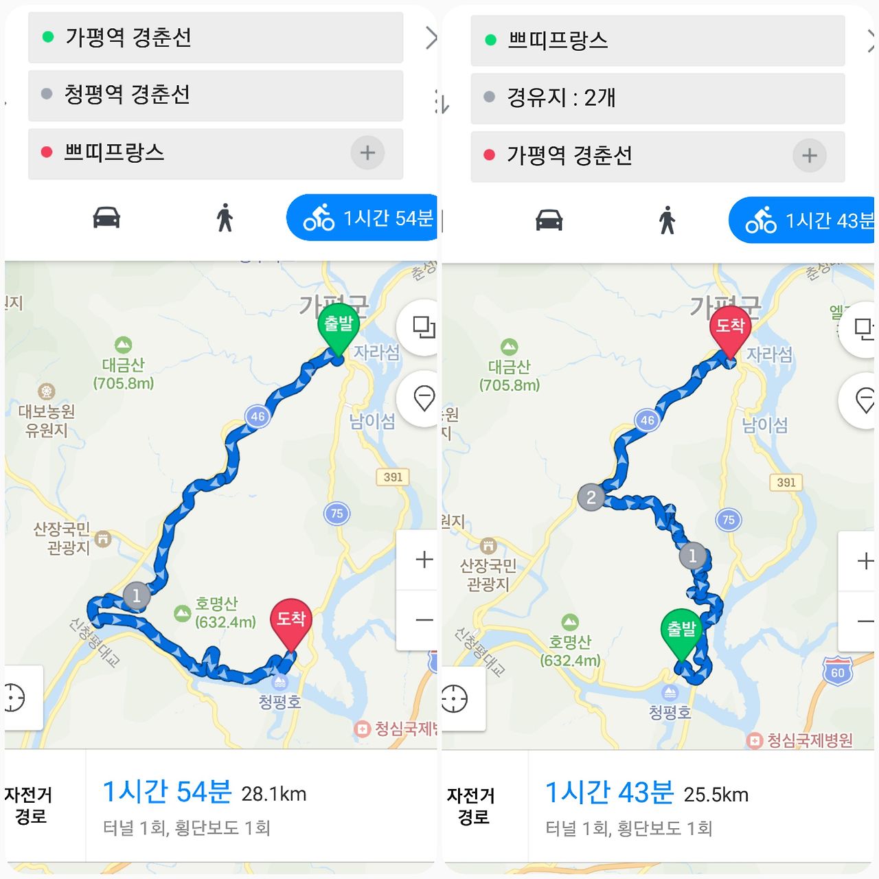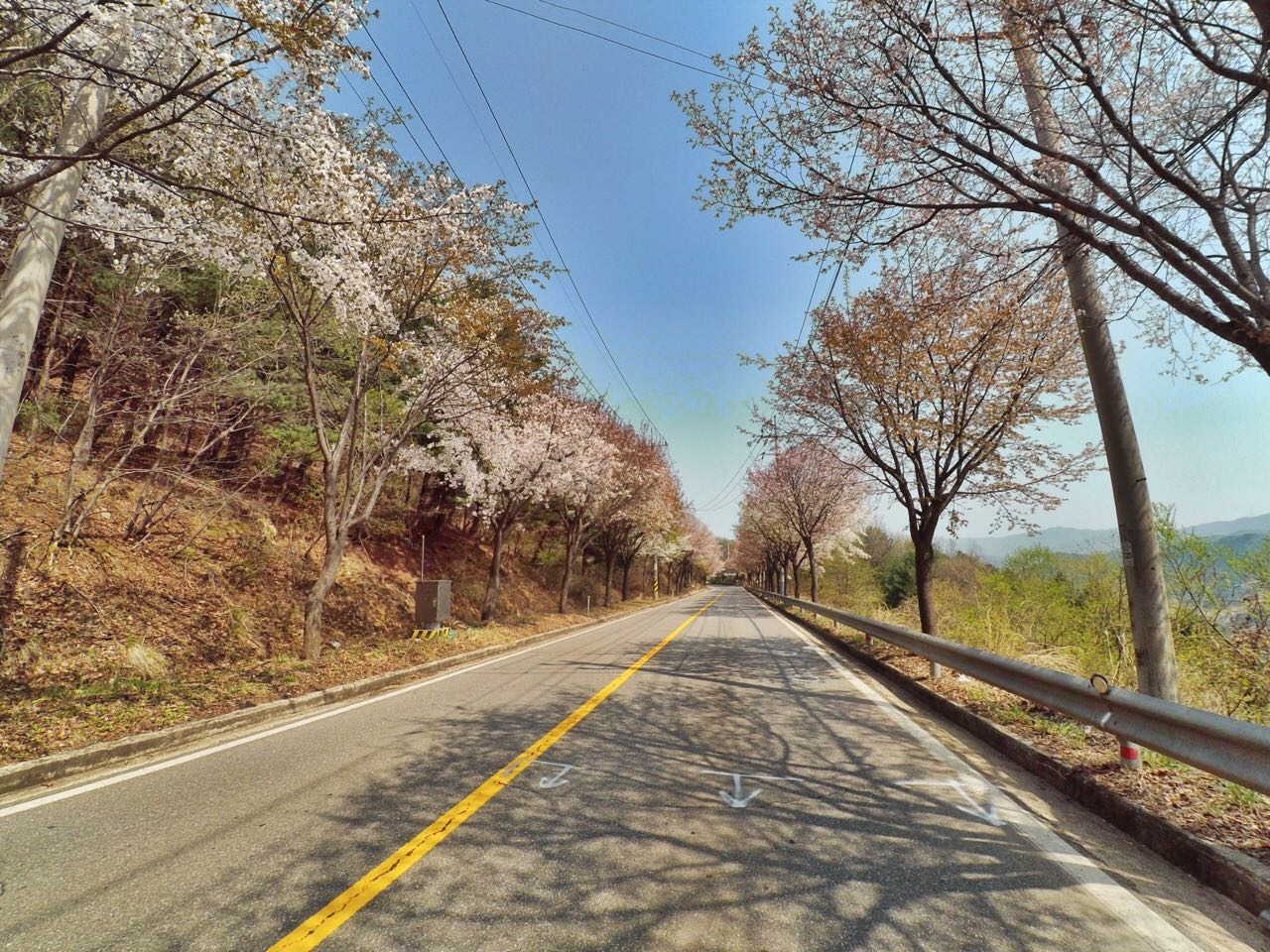 쁘띠 프랑스까지 가는 공도는 오른편으로 강을 끼고 달리는 아름다운 라이딩 코스이다. 꽃피는 봄이 되면 흩날리는 눈꽃으로 낭만 속 여행을 하게 되는 그런 길이다. 이 길을 달리는 커플이 있다면 황순원의 <소나기> 에서 처럼 순수한 마음이 되지 않을까.