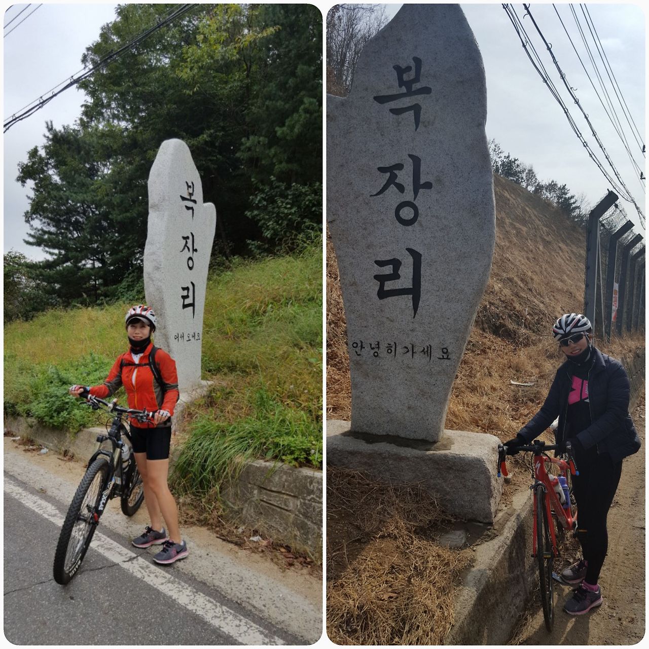 완만한 업힐이 계속 이어진다. 길도 좋고 풍경도 좋아 거침없이 달렸다. 그러다 쁘띠프랑스 부근에 오면 업힐이 세진다. 생각보다 힘들었다. 다리에 쥐가 나지 않도록 최대한 천천히 올랐지만 결코 만만치 않았다. 쁘띠프랑스부터 복장리까지는 중간에 시원한 다운힐이 한번 있을 뿐 꾸준히 업힐이다. 복장리로 들어서면 업힐은 더욱 가파르다. 종아리에 지금껏 느껴보지 못한 무게가 느껴진다. 힘들게 올라 복장리 표지석까지 도달해 인증샷을 찍었다.