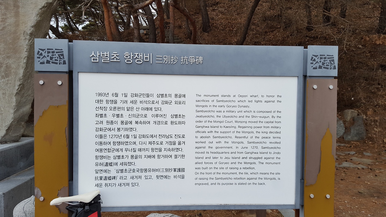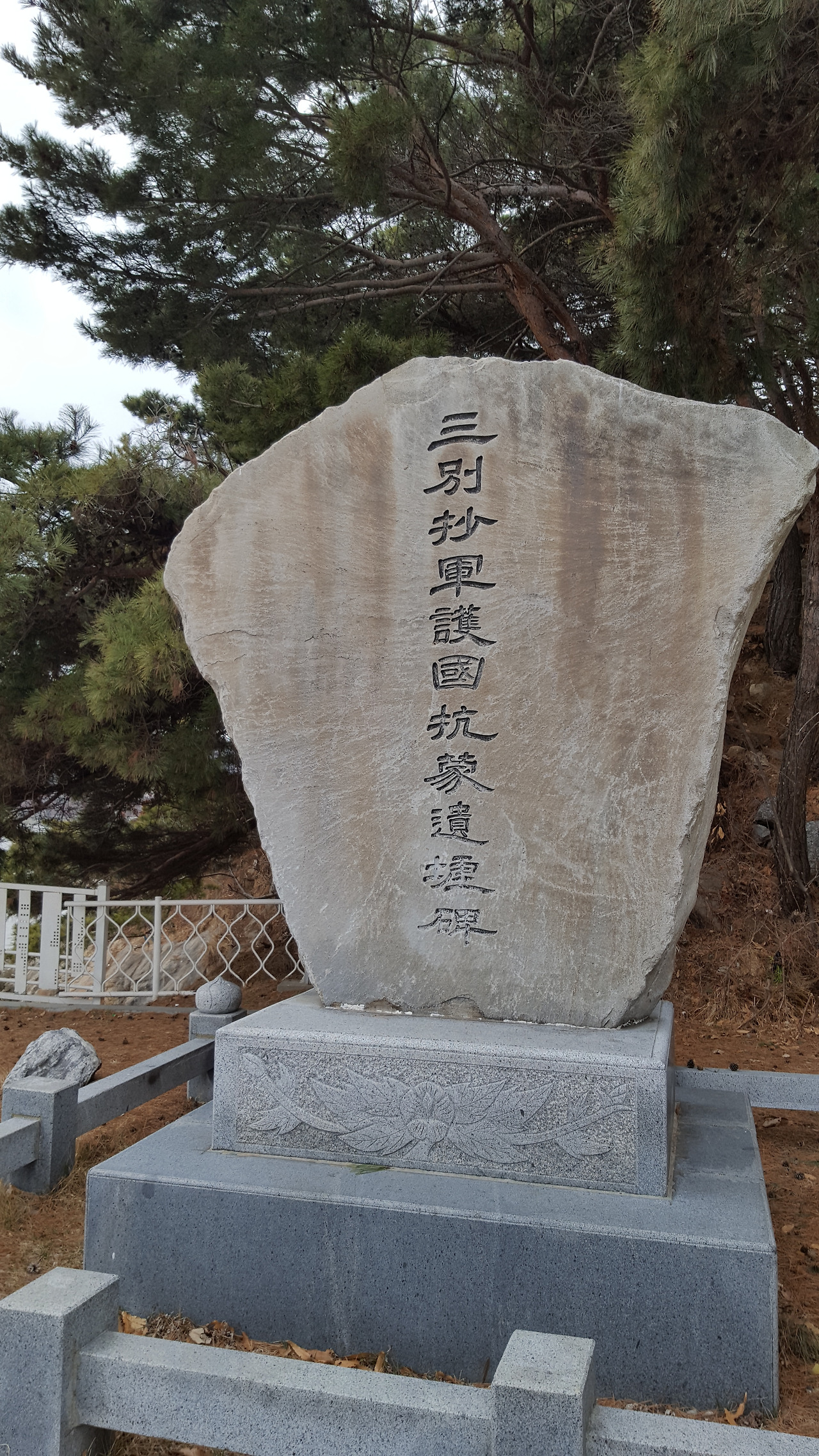 망양돈대에 도착했다. 이 곳엔 삼별초 항쟁비가 있다. 몽고 항쟁 시 마지막까지 투항하지 않고 모두가 목숨을 조국에 바친 이들이 삼별초이다. 삼별초는 고려 무신정권 때 조직된 특수부대로 좌별초, 우별초. 신의군으로 이루어져 있다. 전란 전에는 치안유지 등을 목적으로 하는 부대였으나 대몽항쟁 시기 고려의 저항 상징으로 끝까지 분투하다 제주도에서 그 막을 내렸다. 그래서 항쟁비 앞에는 제주 하루방이 있어 그들의 제주도 항쟁을 기억하고 있다. 삼별초의 항쟁이 끝이 나면서 고려는 원나라에 완전히 복속되게 되고 슬픈 고려말의 역사가 시작된다.