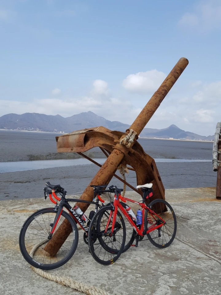 초지진을 지나서 동막해변을 향한다. 왼편으로는 썰물로 갯벌을 드러낸 서해바다가 이어진다. 중간에 작은 항구가 있어 잠시 들른다. 썰물 때라 물이 다 빠져 배들이 뻘 위에 있다. 걸어서는 한참을 들어가야 하는 항구 끝이지만 자전거로는 금세 도착한다. 녹슨 닻이 있다. 무게가 어마어마하다. 한때는 자기의 역할을 묵묵히 했을 거대한 존재가 배가 아닌 육지 위에 덩그란히 놓여 있는 것이 왠지 모를 쓸쓸함으로 다가온다.