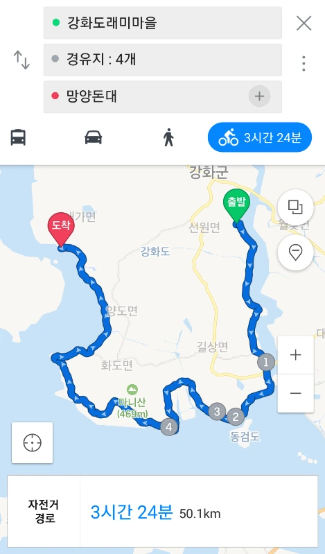 계속 업다운을 반복하면서 강화도 남부 해안선을 지난다. 뷰가 워낙 좋다 보니 펜션이 많다. 따라서 차의 통행량도 많다. 조심히 지나야 한다. 편의점등도 많으므로 보급은 용이하다. 선수 선착장을 향했다. 이 곳에서 석모도로 가는 다리가 있는 줄 알았는데 석모도 들어가는 배편만 있었다. 석모대교는 13km 북쪽에 위치해 있었다. 시간이 애매했지만 일단 석모대교를 향했다.