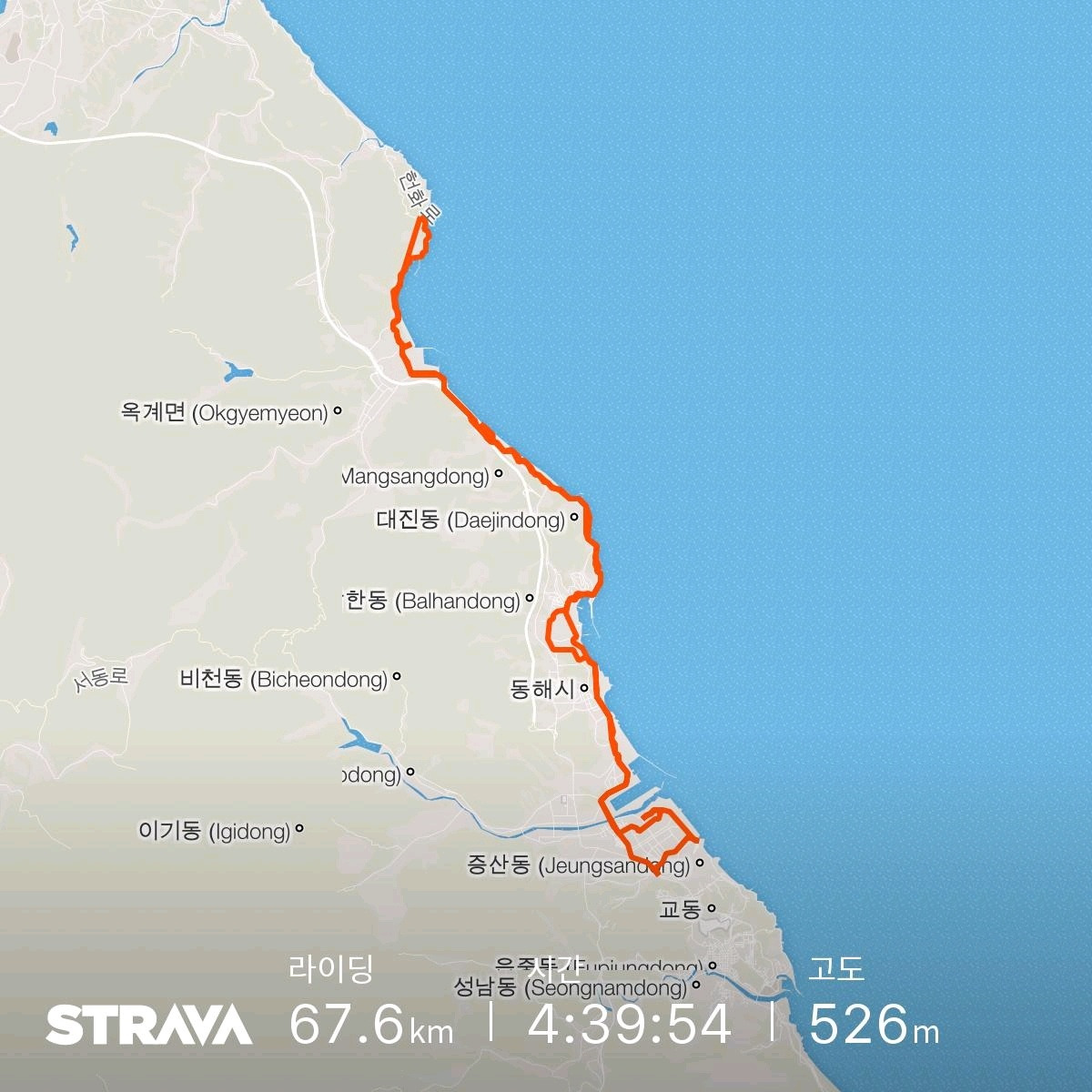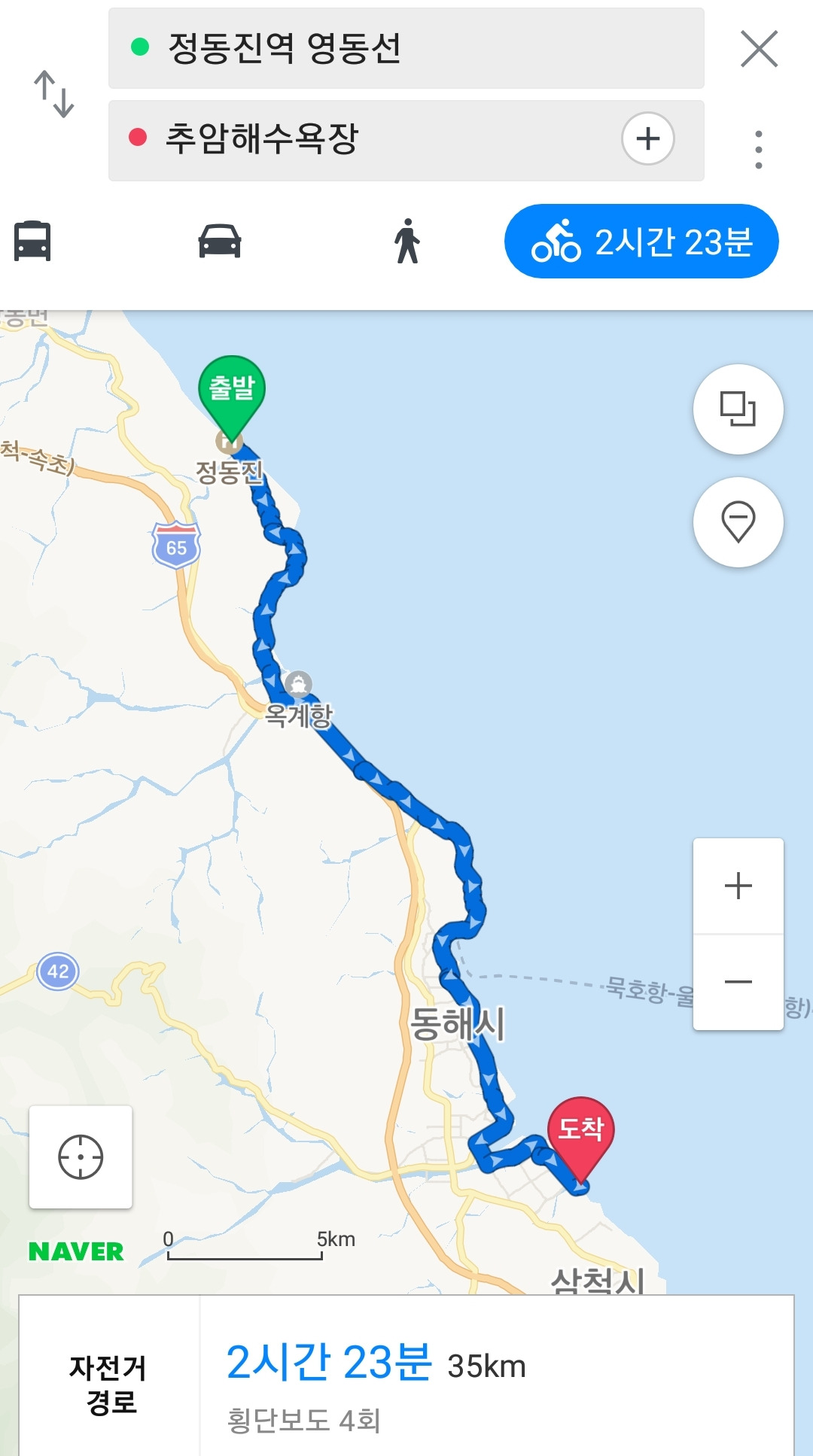 코스 : 정동진 심곡항 ~ 금진해변 ~ 옥계해변 ~ 망상해수욕장 ~ 어달해변 ~ 묵호항 ~ 동해항 ~ 추암해수욕장 왕복 약 70km