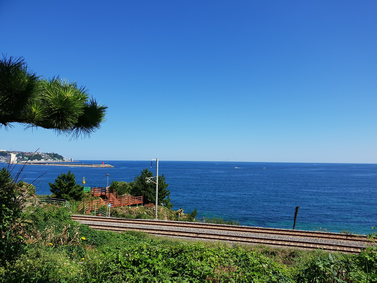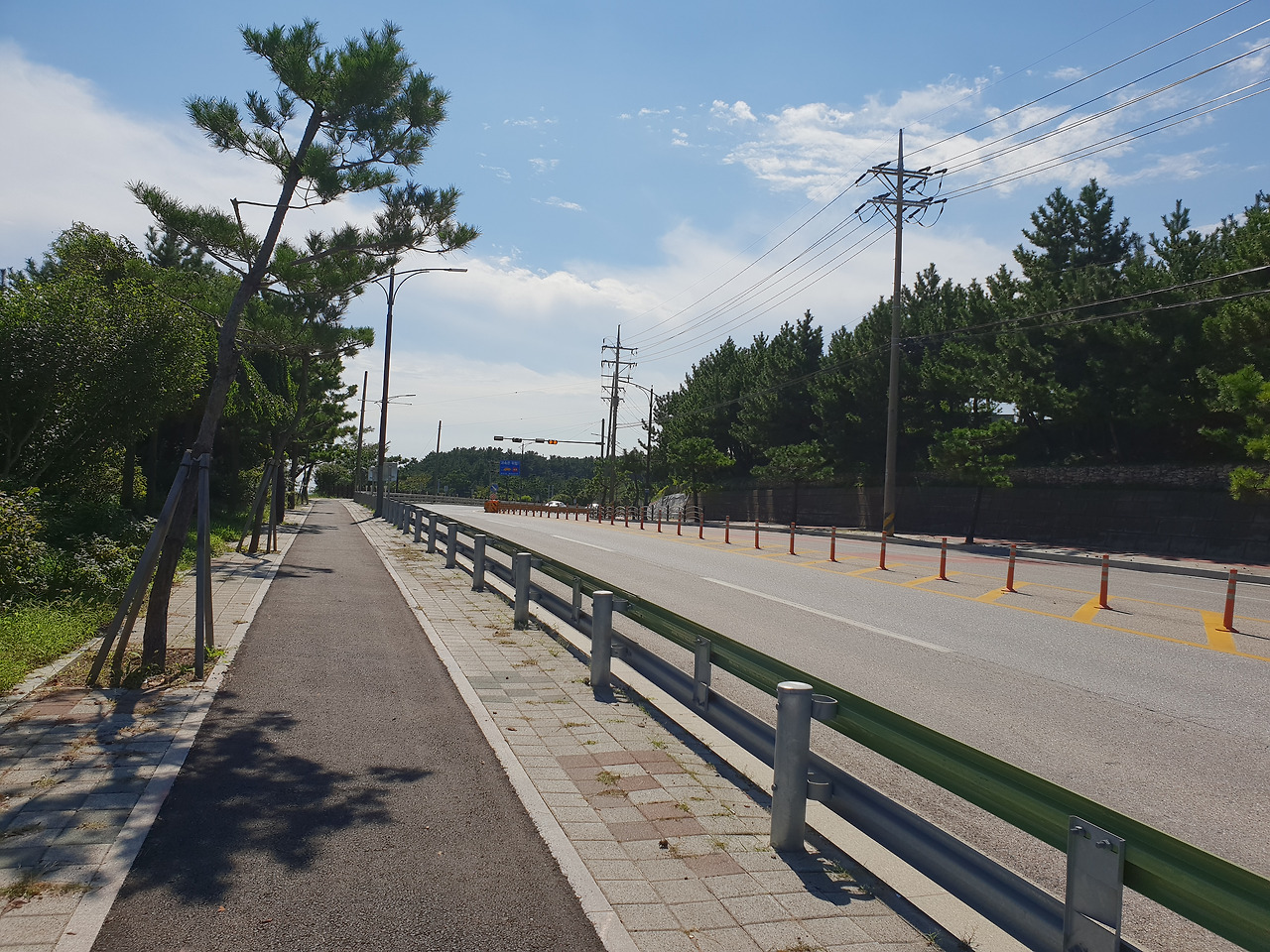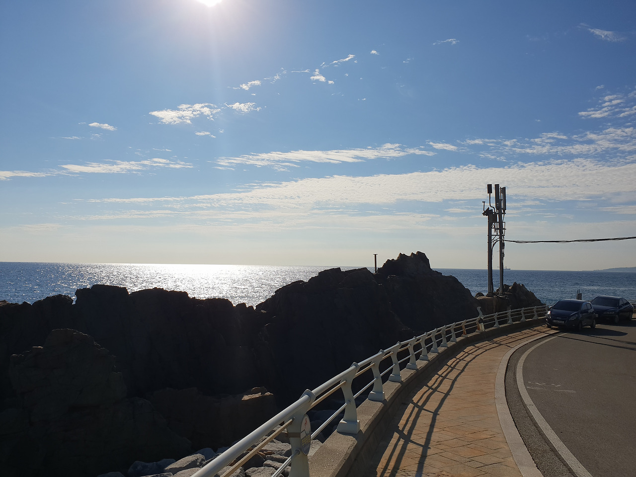도로옆에 차를 세우고 바다를 감상하는 사람들이 꽤있다. 사진으로는 다 담을 수 없는 근사함. 그나마 눈만이 가장 왜곡없이 담을 수 있다. 기억의 유한함에 이 또한 시간이 지날수록 희석되겠지만 지금은 눈으로 담을 수 있는 만큼 꽉 채운다. 신나게 달려 금진해변, 옥계헤변을 지난다. 망상해수욕장까지는 크고 작은 공사가 많아 자전거길이 원활치 않다. 파란 선을 따라 달리다보면 중간중간에 끊겨있어 당황스러운 경우가 많았다. 망상해수욕장 부근의 오토캠핑장부터 다시 길은 좋아지고 그림과 같은 어달해변을 만난다.