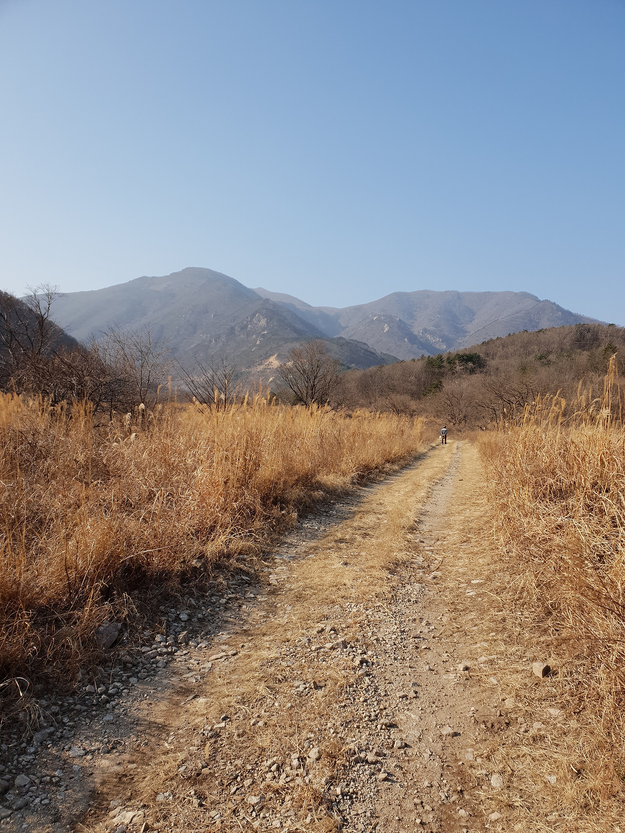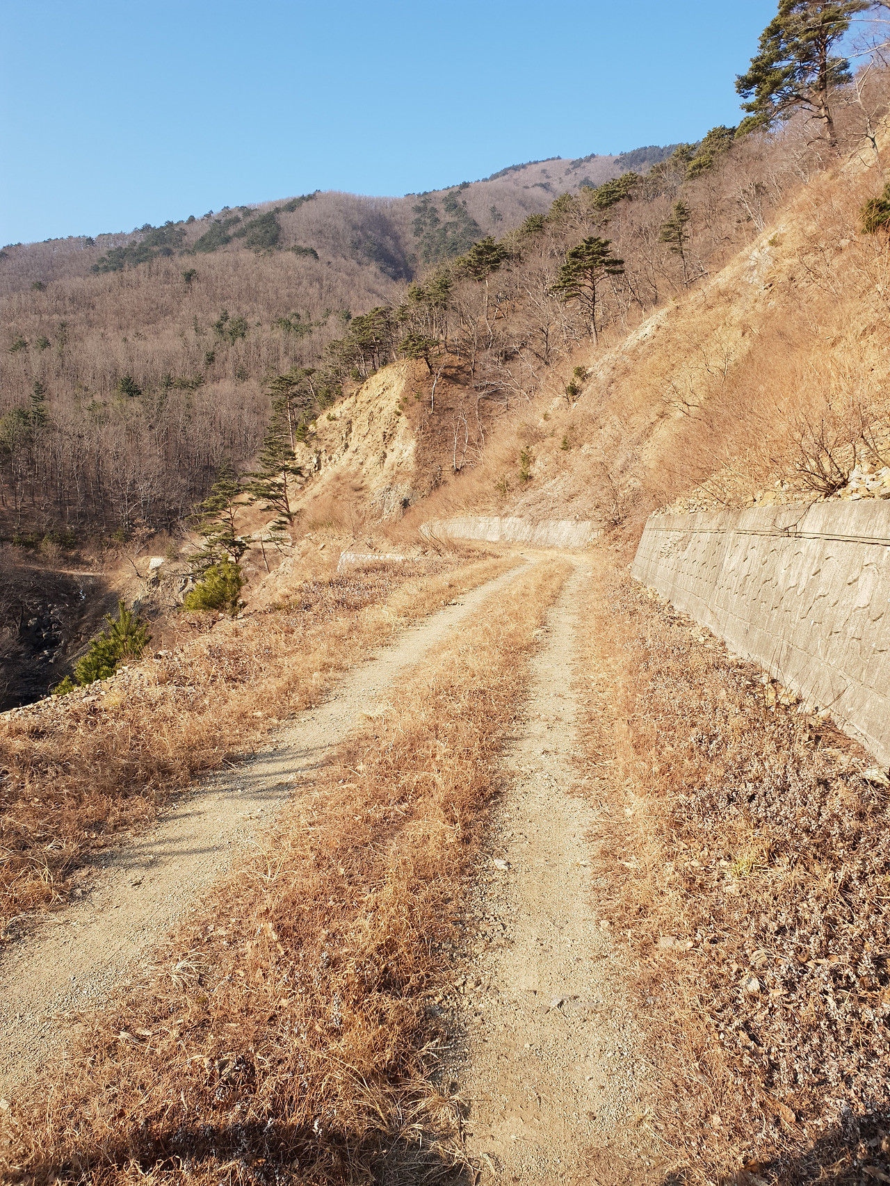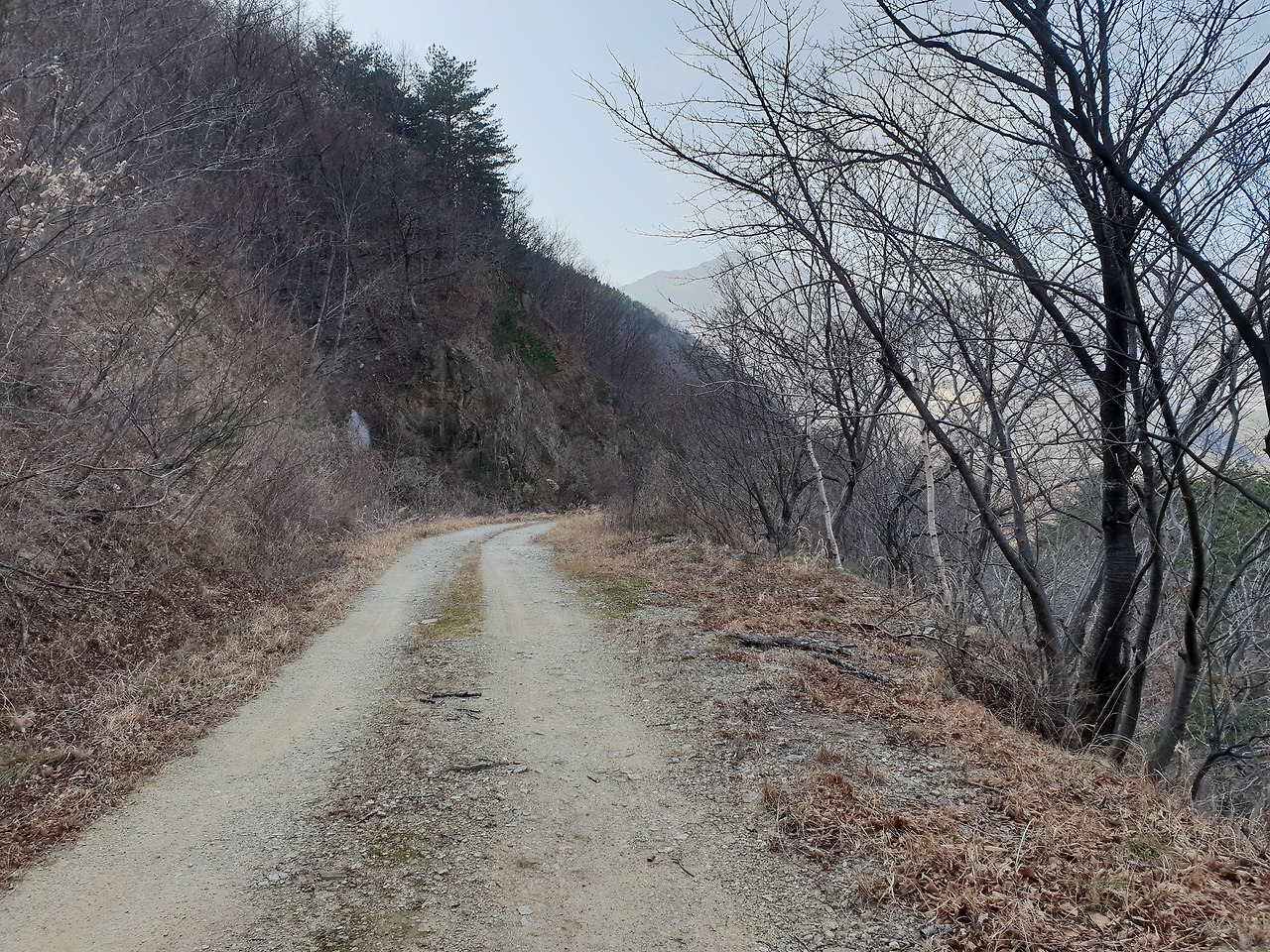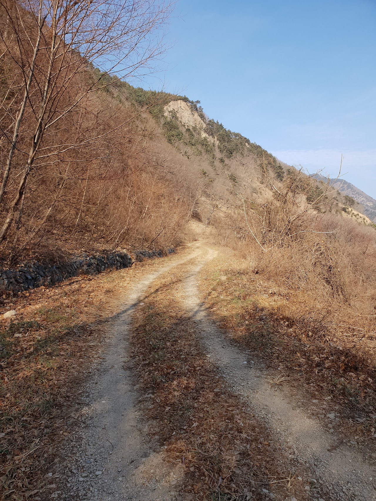 임도 들머리부터 우거진 숲으로 마음이 편해진다. 개인 사유지를 살짝 지나면 본격적 임도가 시작된다. 두 번째 안내판이 있는 삼거리까지 편히 오른다. 여기서 왼편으로 다리를 건너면 새이령 방향, 오른쪽으로 가면 원터와 굴바위 쉼터를 지나 새이령이 나온다고 쓰여있다. 오른편 원터를 지나 새이령을 오르려 길을 정했지만 조금 가니 풀이 우거져 더 이상 진행할 수 없다. 산책하시는 동네 어르신께 여쭤보니 원래 삼거리 주변에 작은 마을이 있었지만 지금은 다 떠나서 길도 없어졌다고 한다. 누군가의 삶의 터전이 시간의 흐름 속에서 사라지고 이제는 남은 흔적들이 과거를 가늠케 한다. 인생의 허무함이 이 계절만큼이나 스산함을 준다.